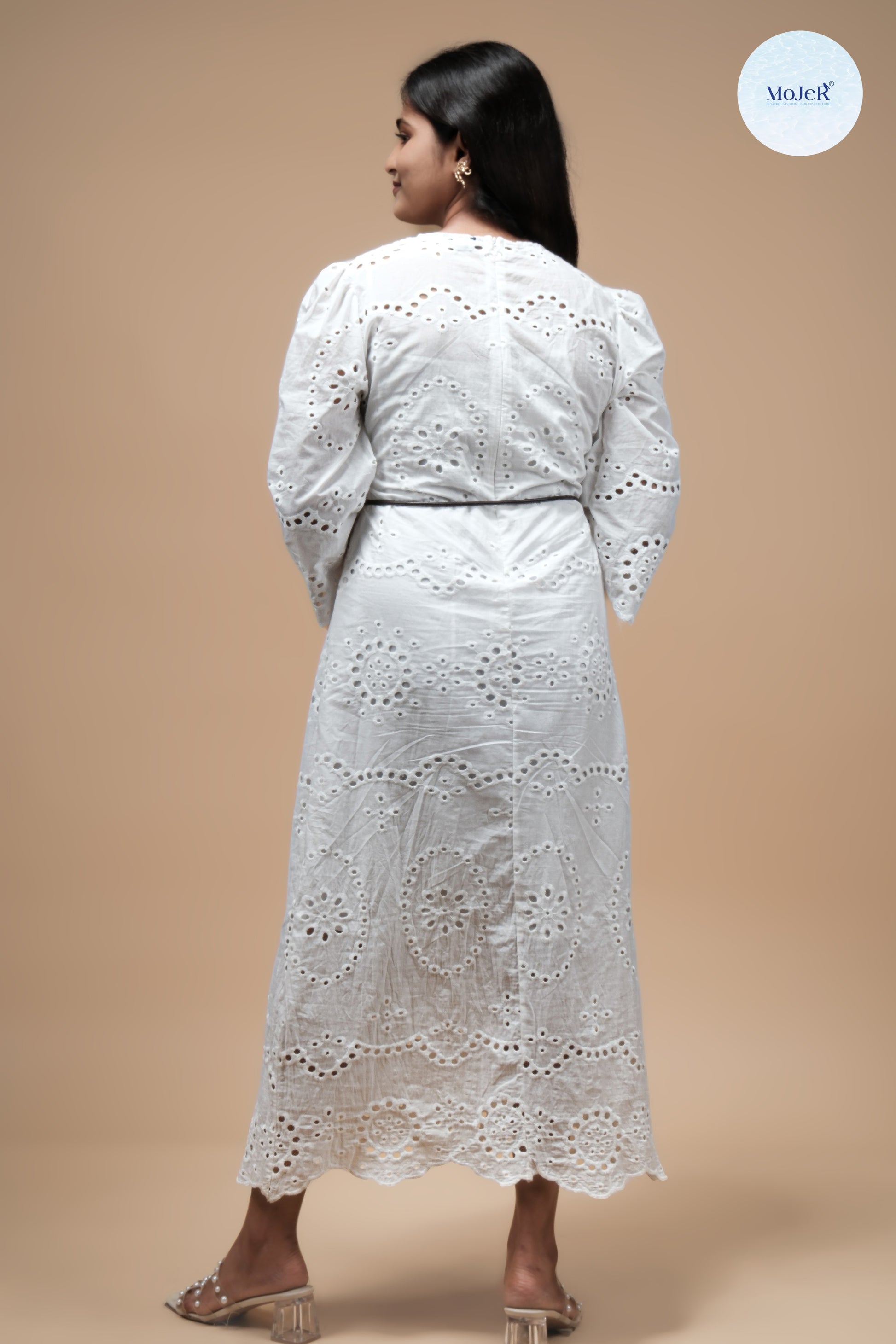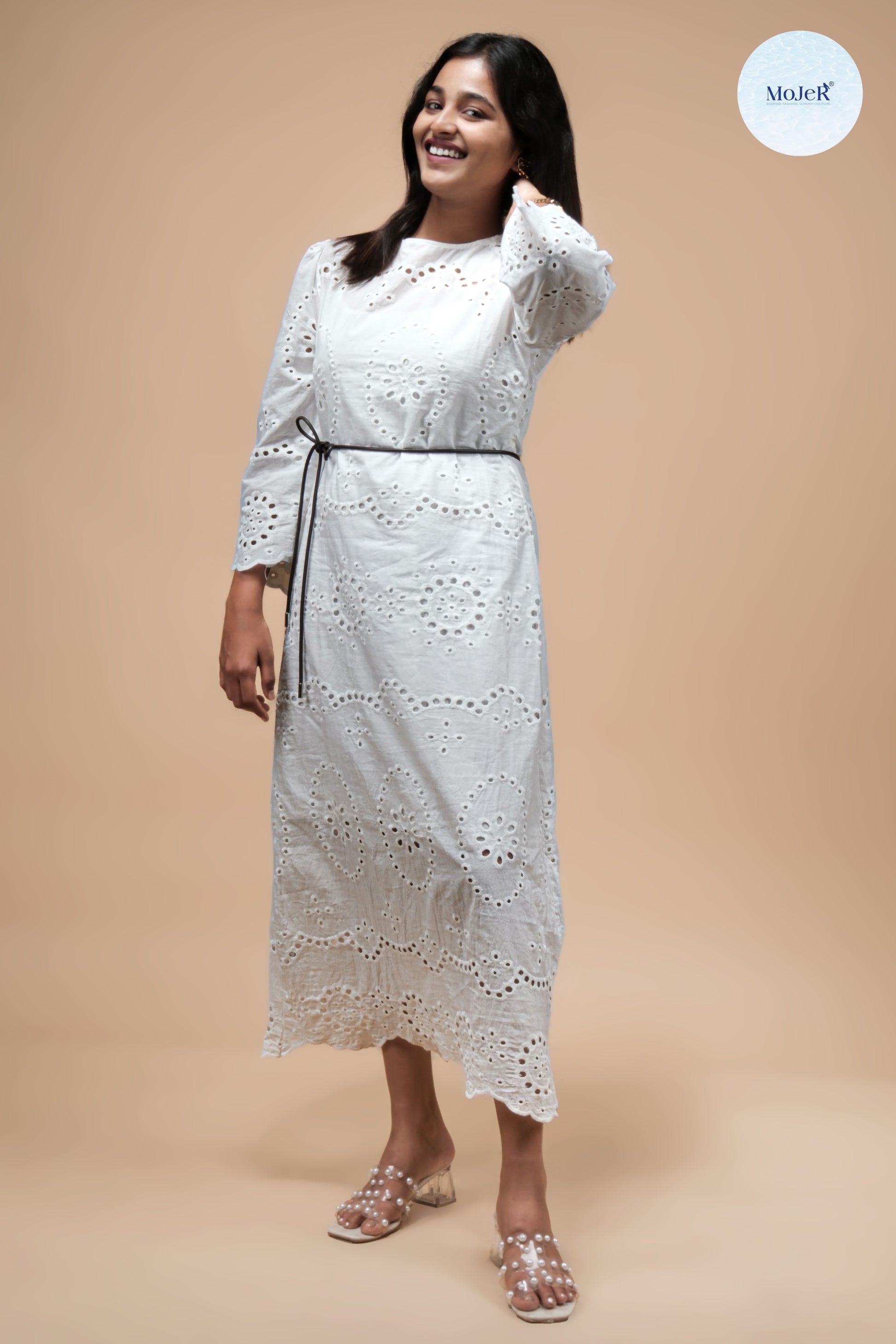 Chic White eyelet embroidered midi dress crafted from breathable cotton. Features full sleeves, delicate cutwork embroidery, scalloped hemline, and a lightweight silhouette. Comes with a detachable waist tie for added shape. Perfect for brunches, get-togethers, and casual evenings.