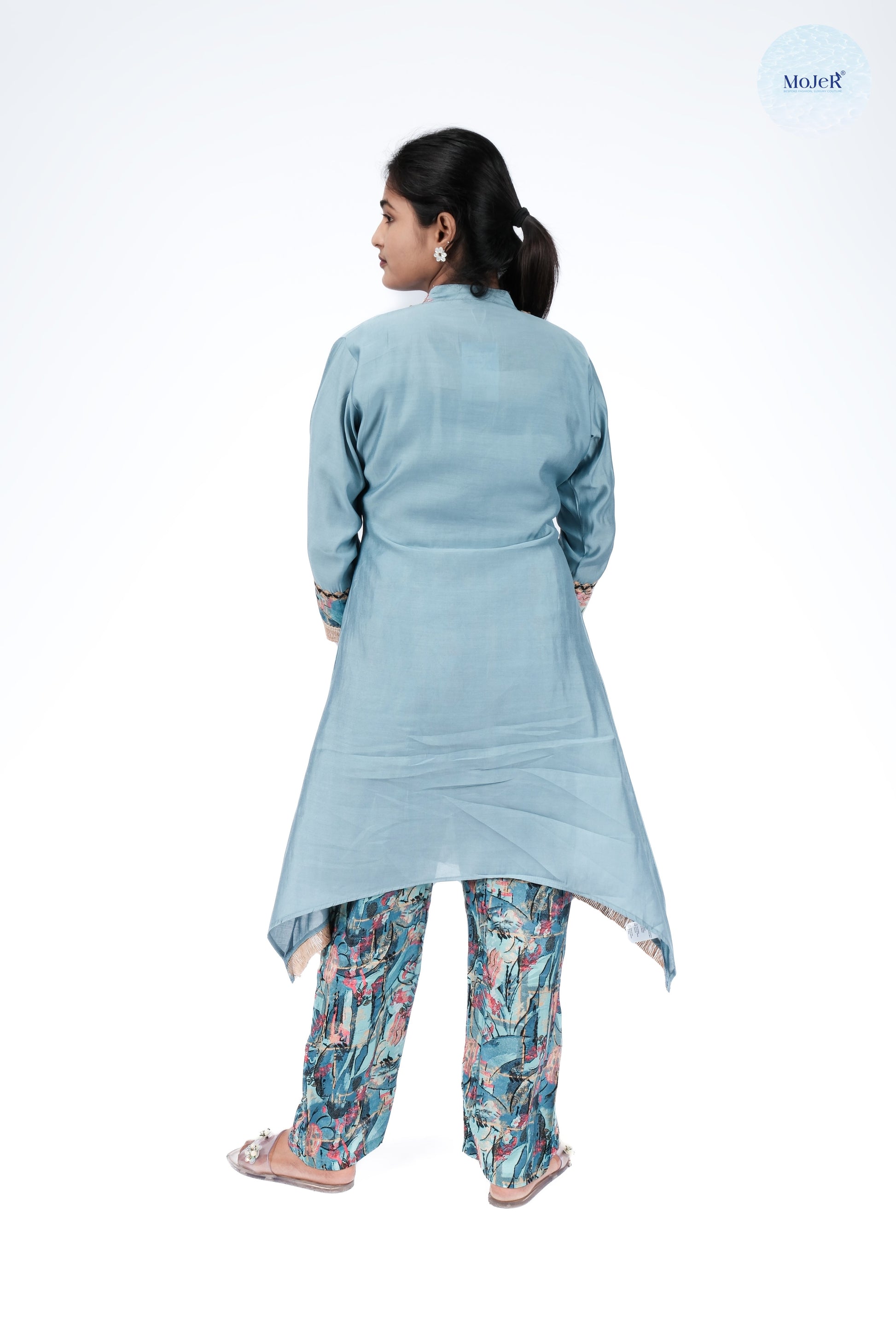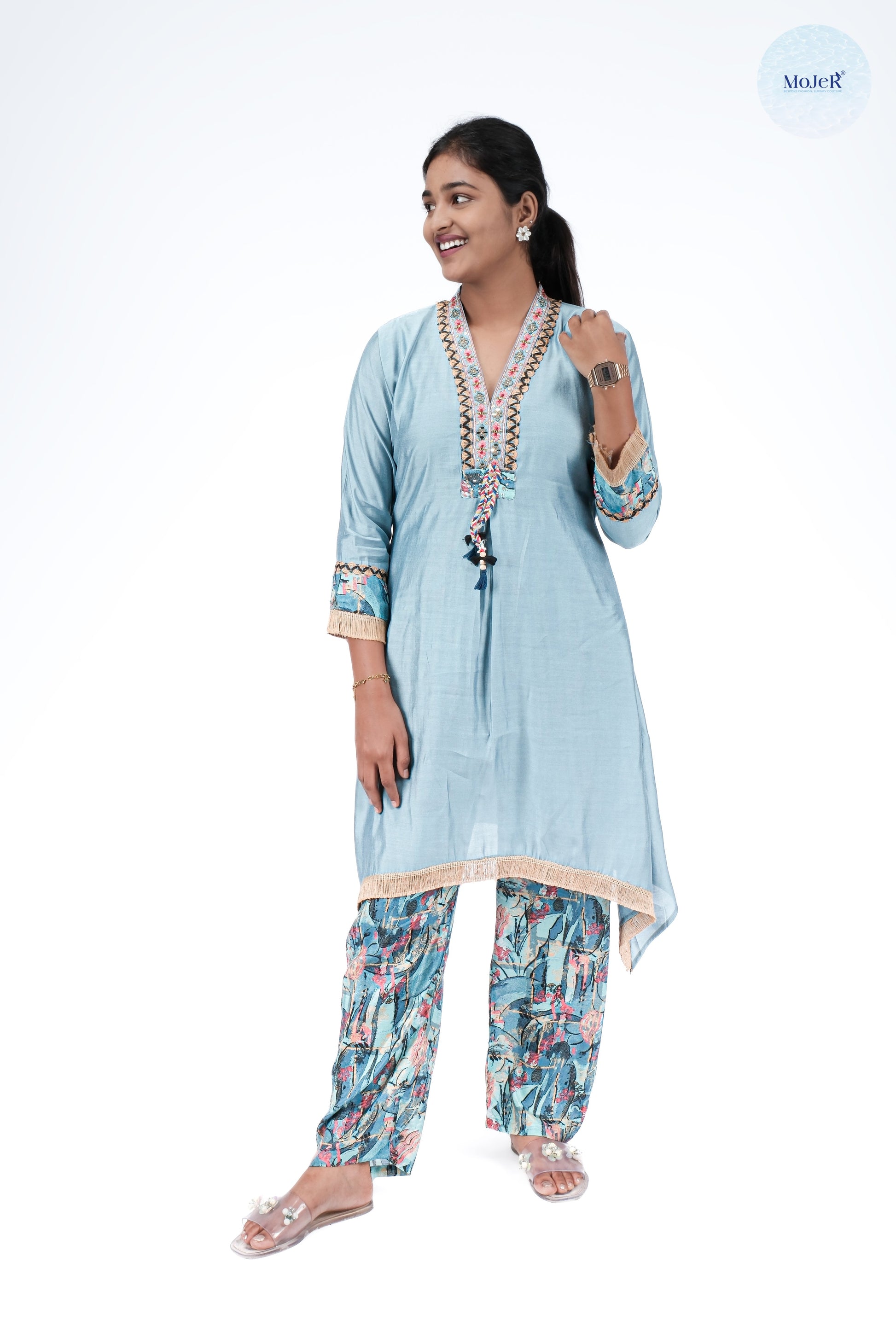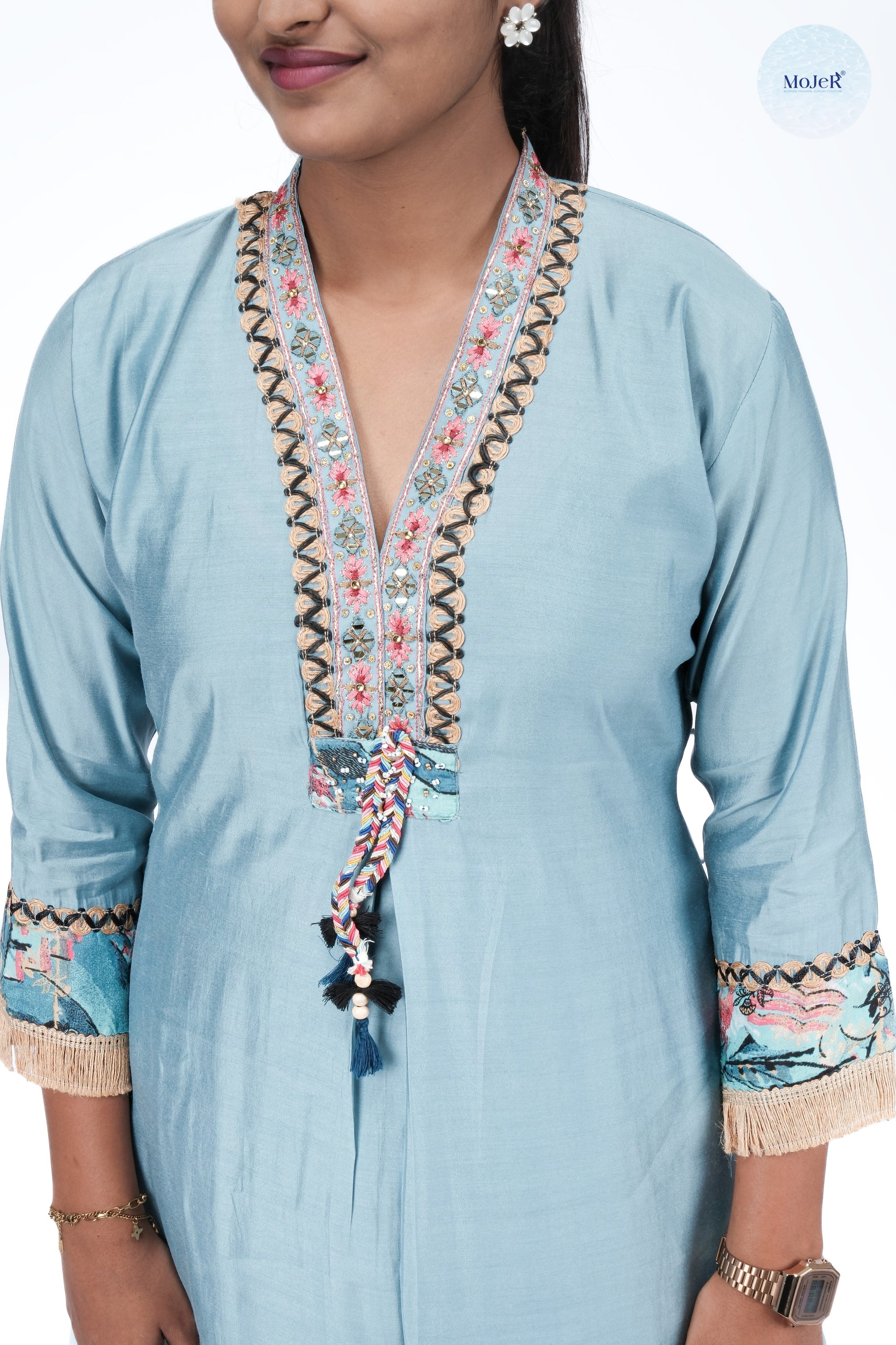 Elegant aqua kurti set with multicolour floral embroidery on neckline and cuffs, finished with tassel tie-up details. Paired with printed pants for a chic festive look.