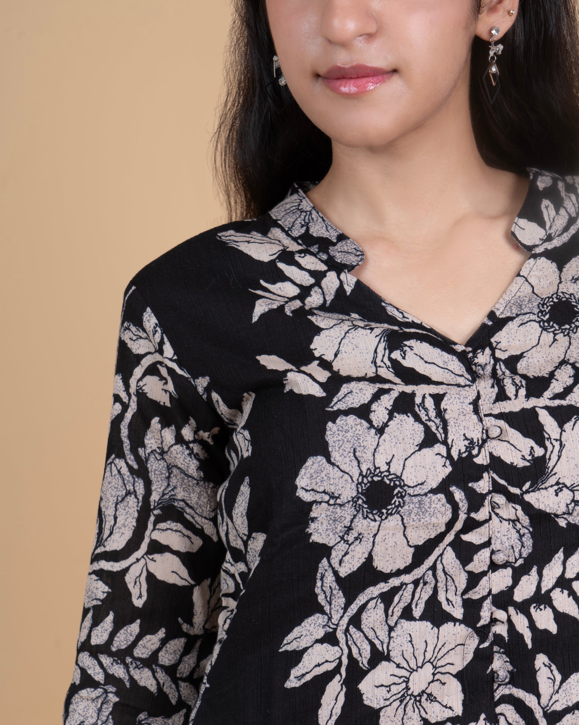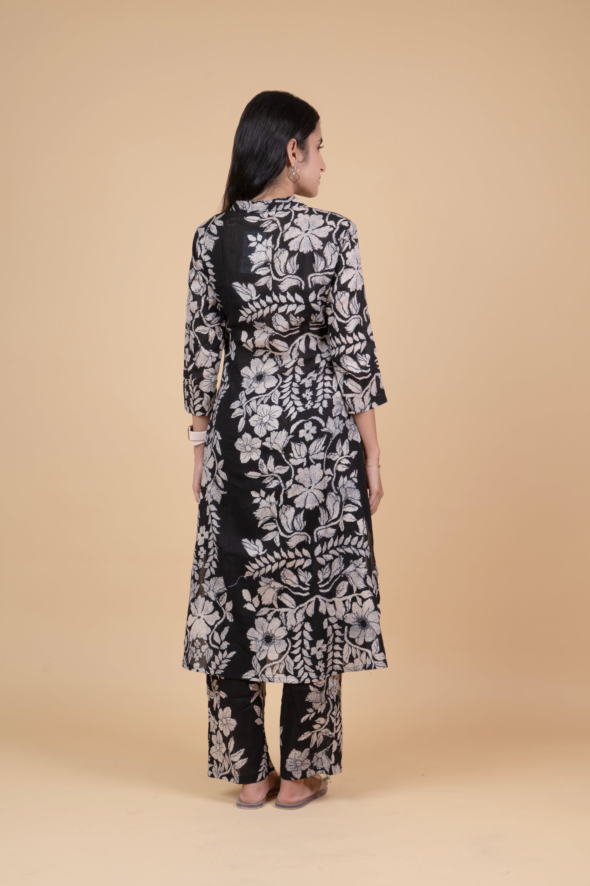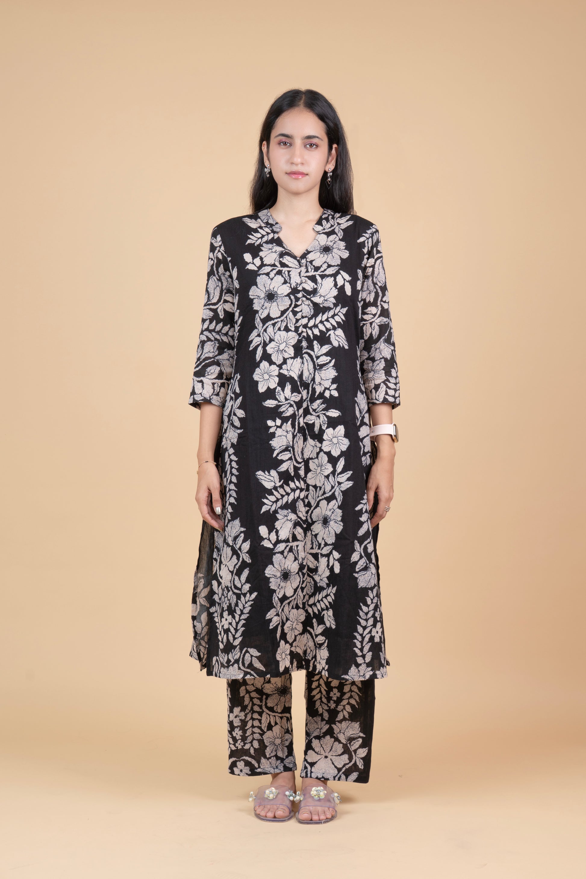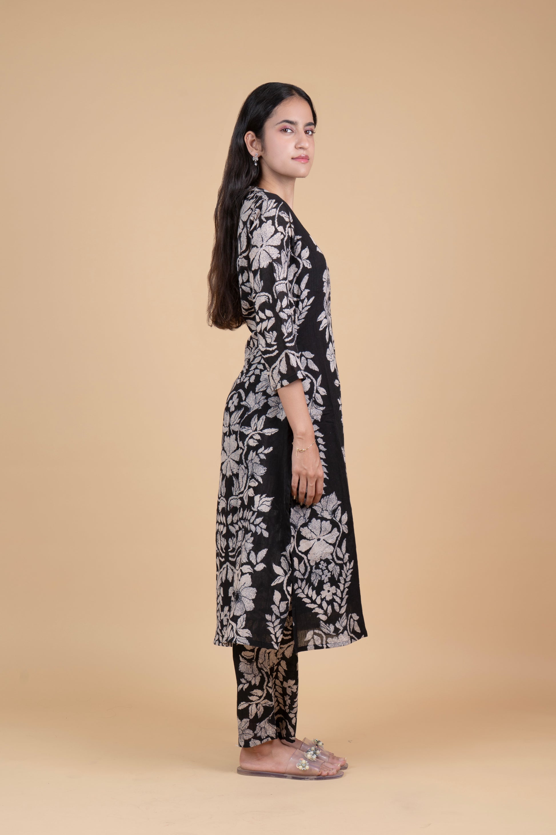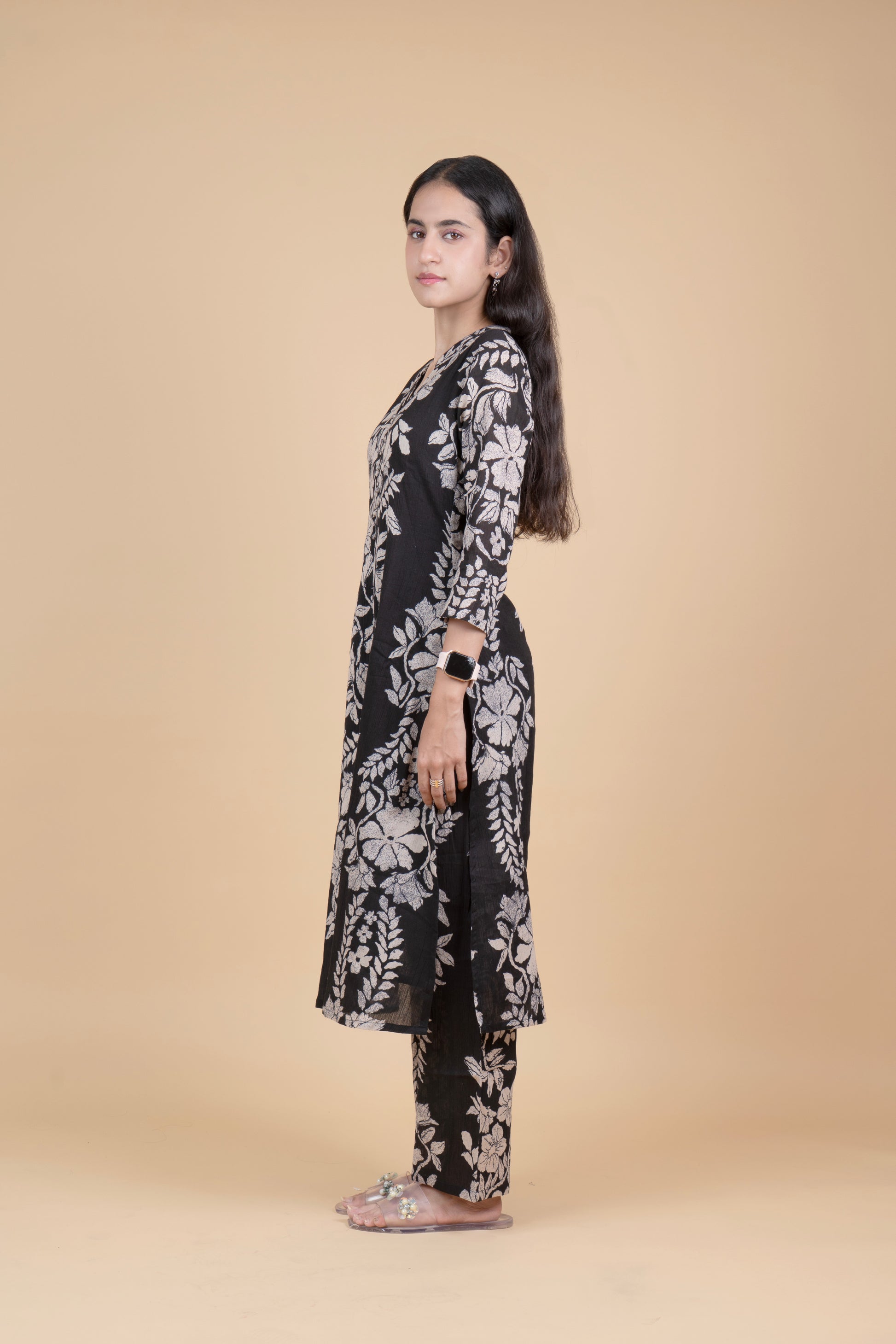 Elegant black kurta set with bold white floral embroidery design, V-neckline, and matching straight pants. A timeless monochrome outfit perfect for formal gatherings, festive evenings, and chic ethnic styling.