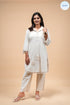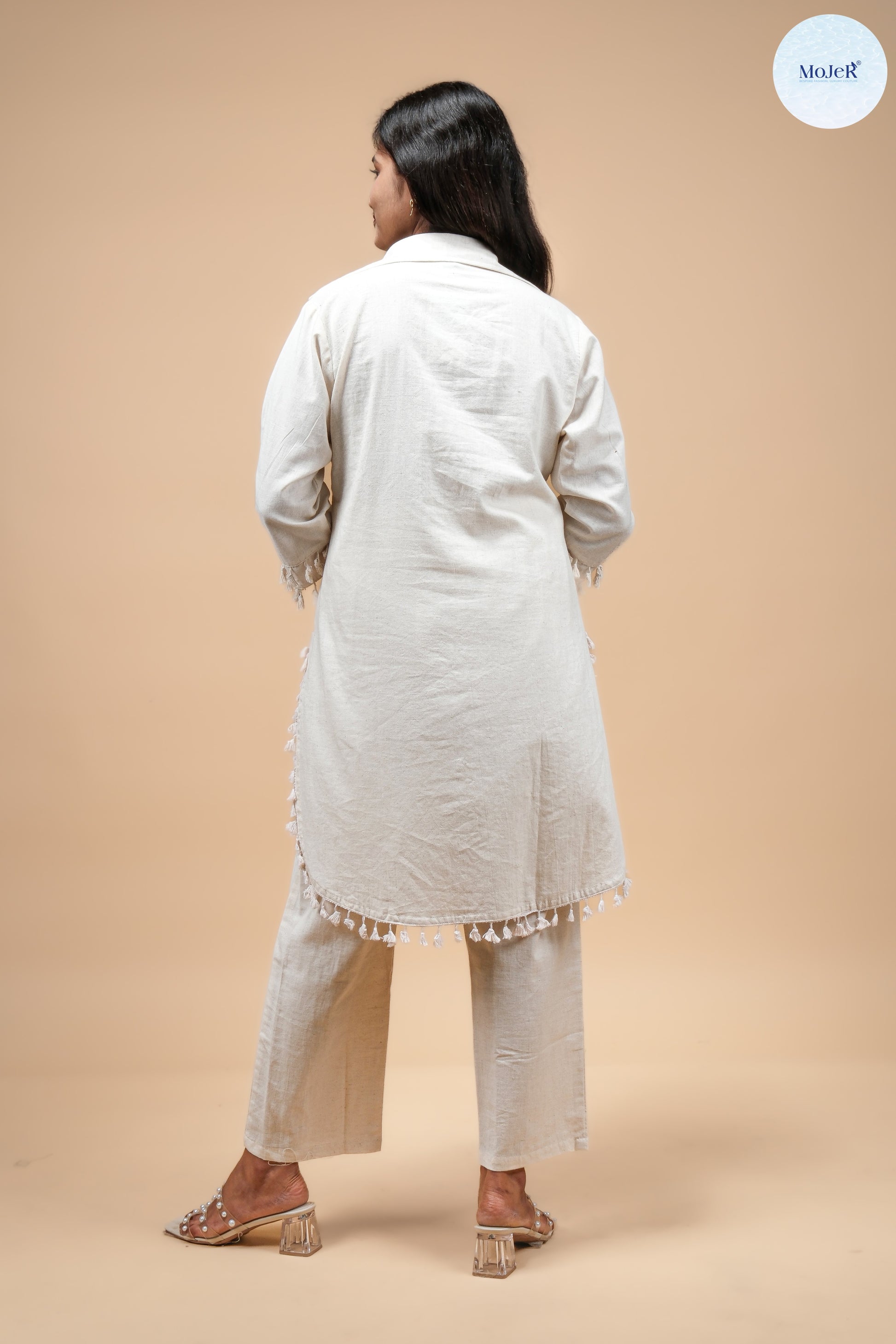 Elegance in simplicity this cream kurta set is designed with intricate floral embroidery and delicate 3D applique work. Features tasseled edges on the hemline and sleeves, adding a chic festive touch. Paired with straight pants for a graceful finish. Perfect for festive gatherings, day functions, and exhibitions.