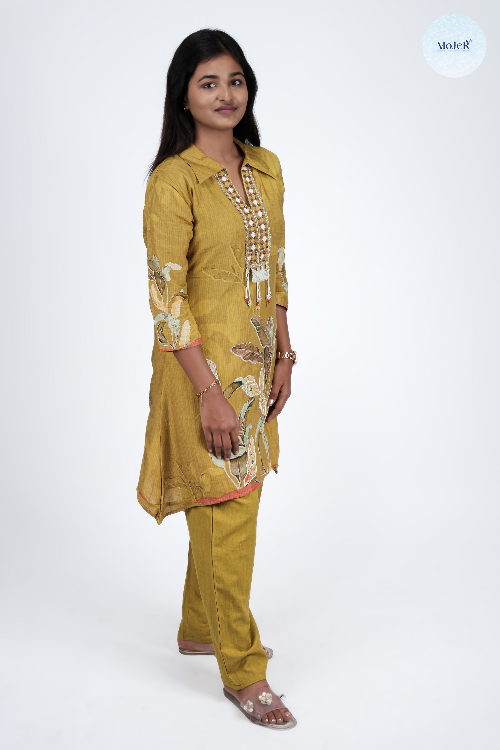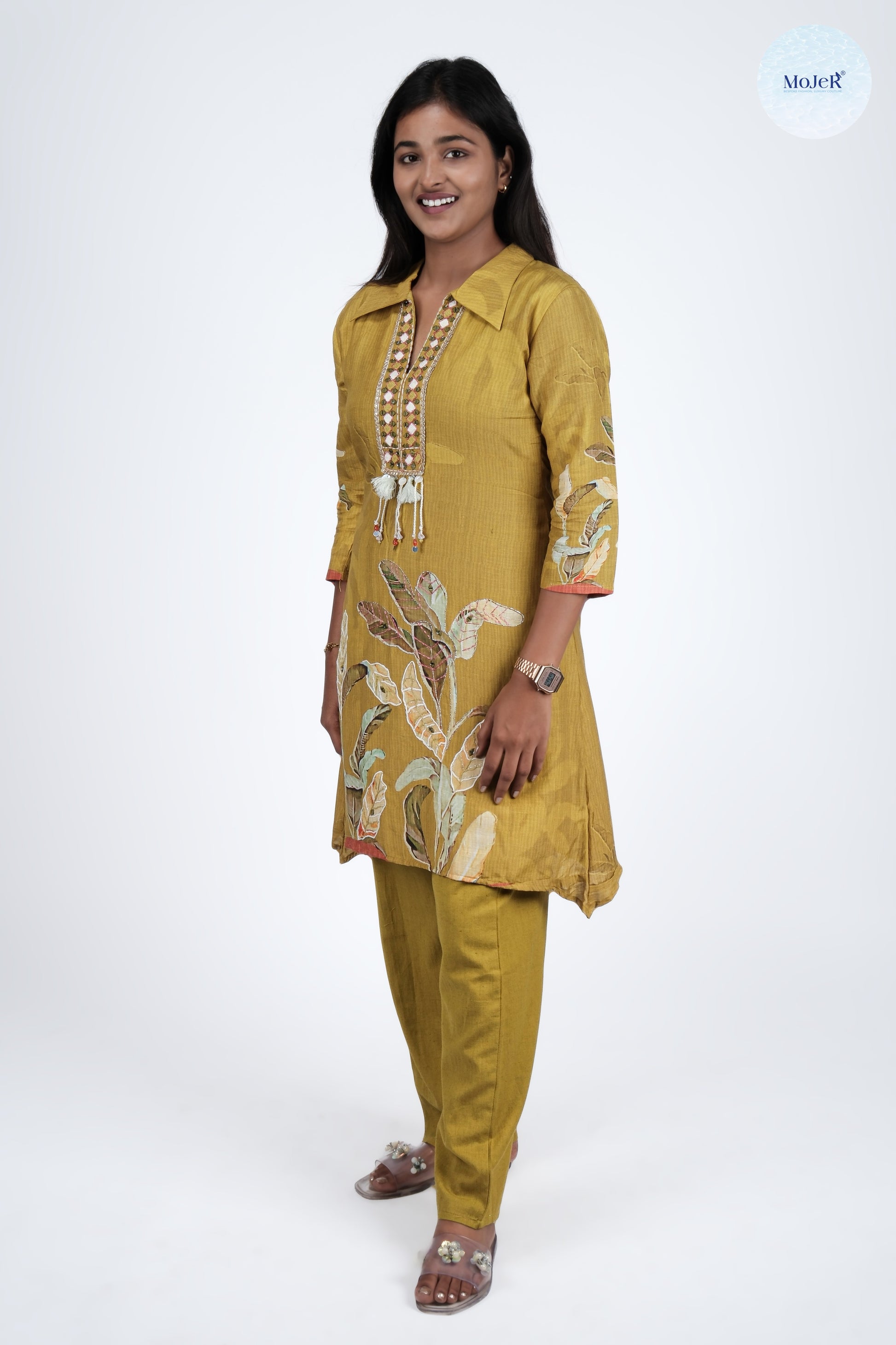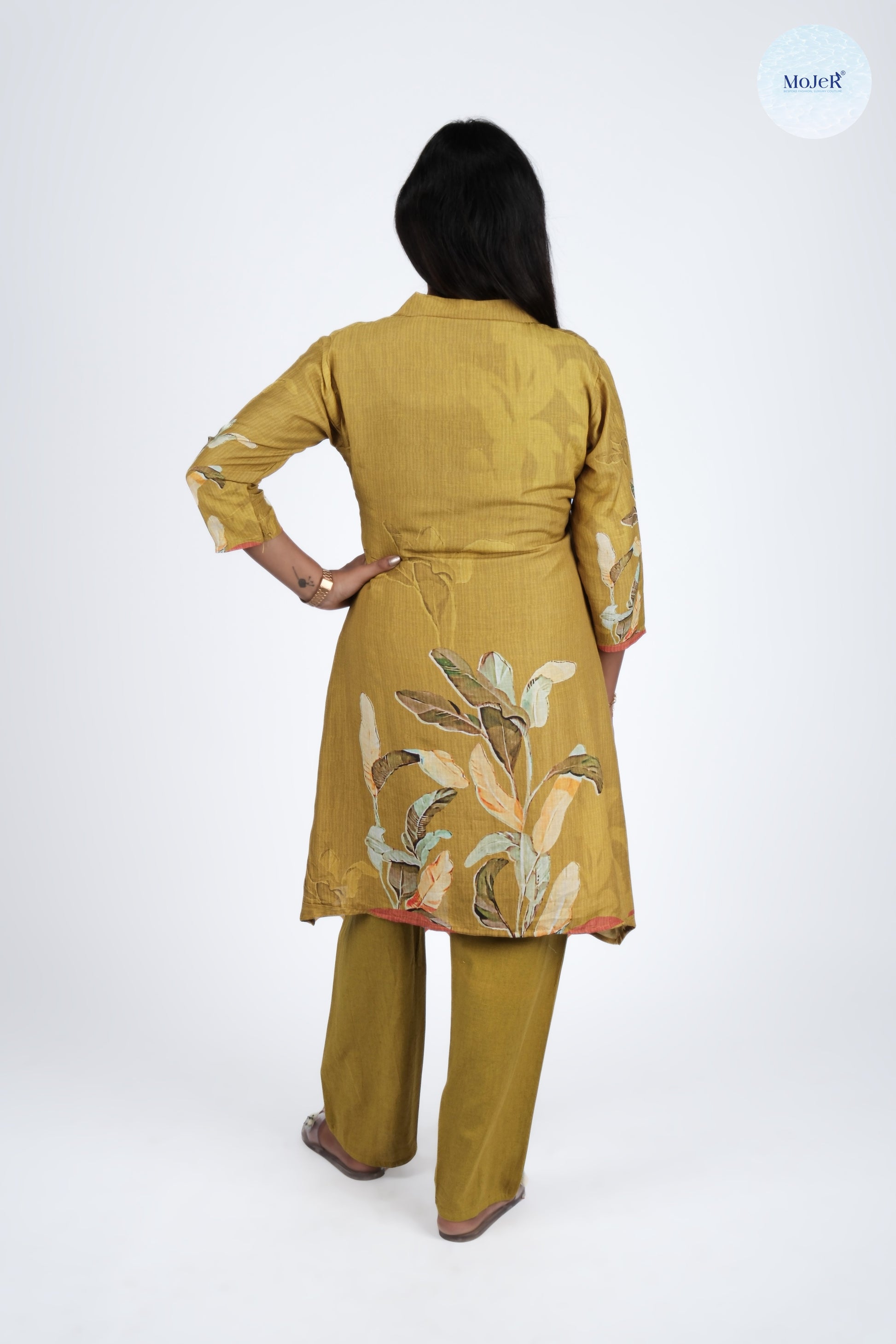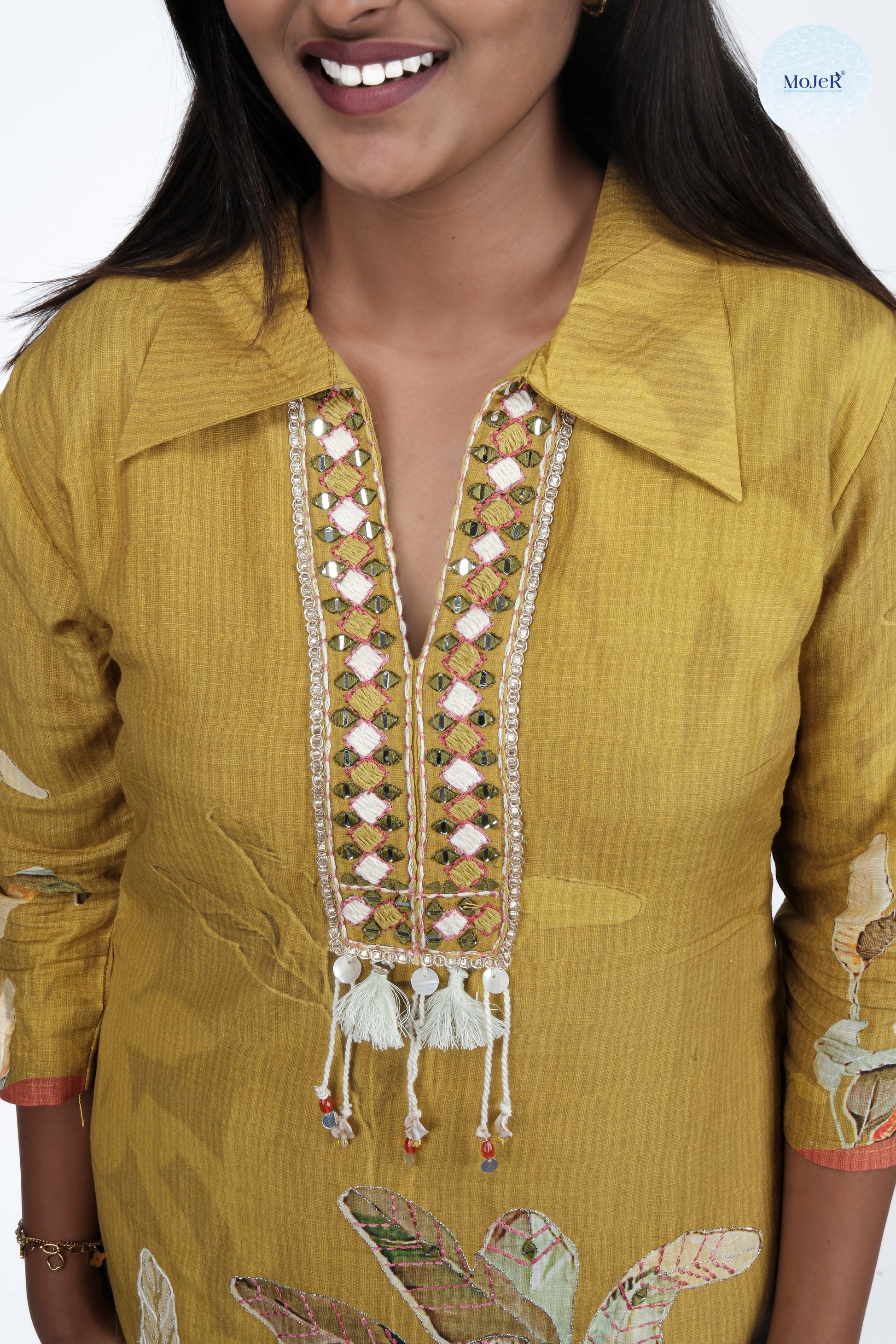 Elegant Olive Green kurta set featuring mirror work neckline with tassel detailing and applique leaf embroidery. Paired with matching bottoms for a festive and artistic appeal.