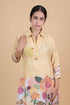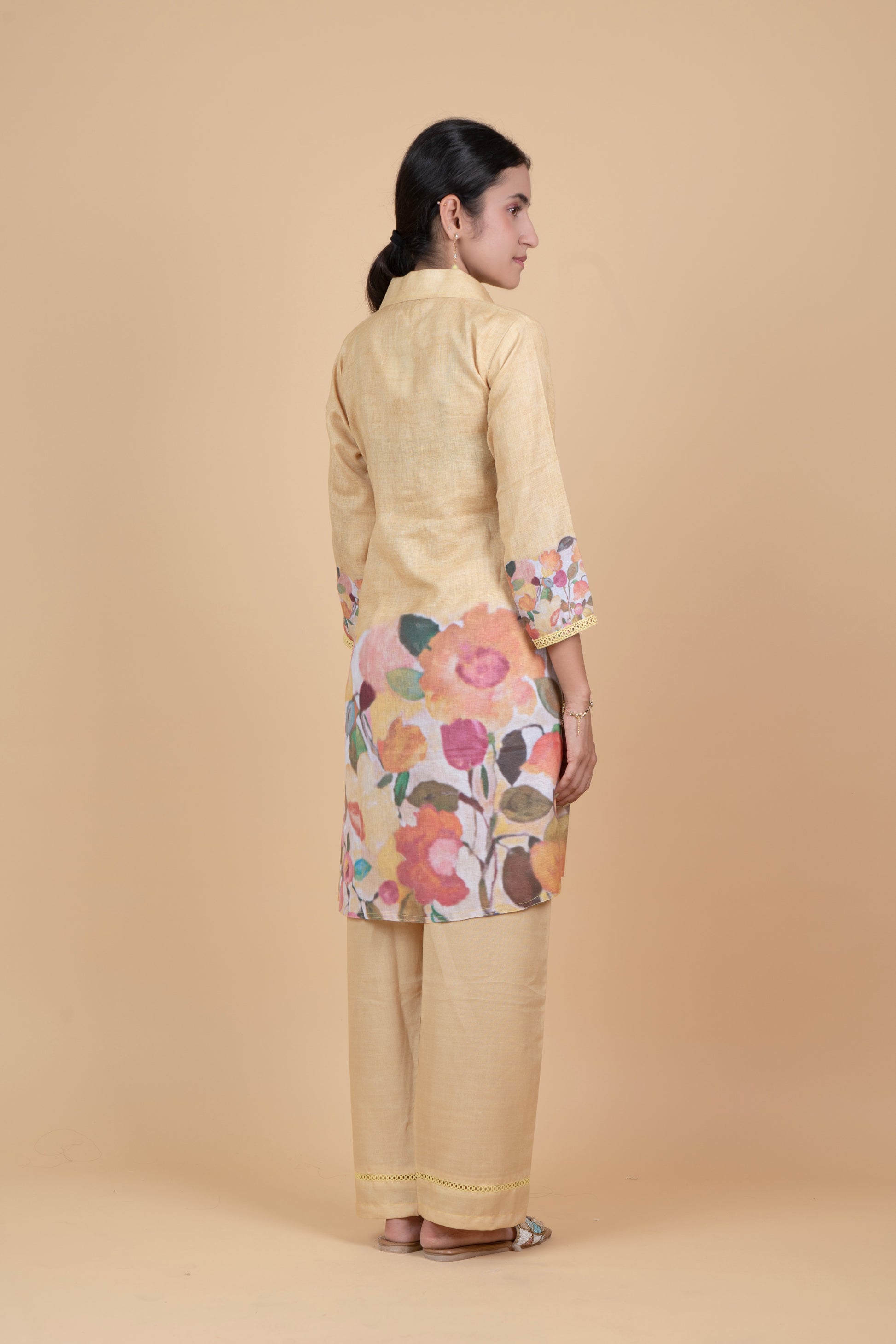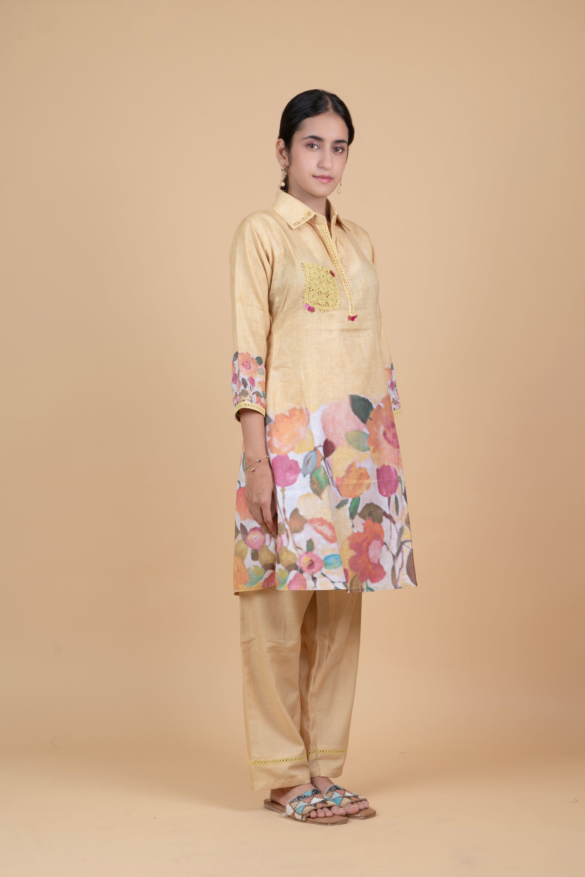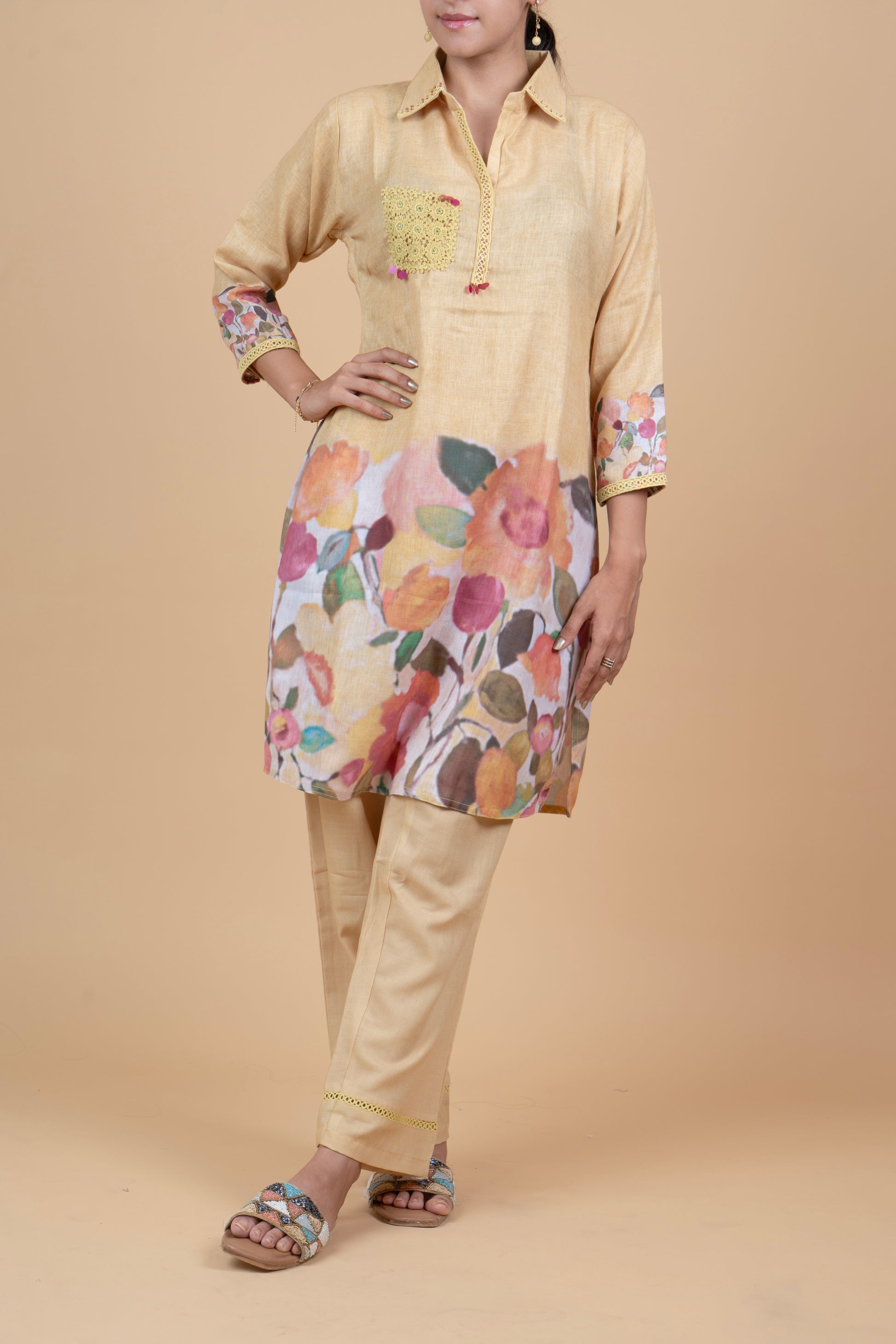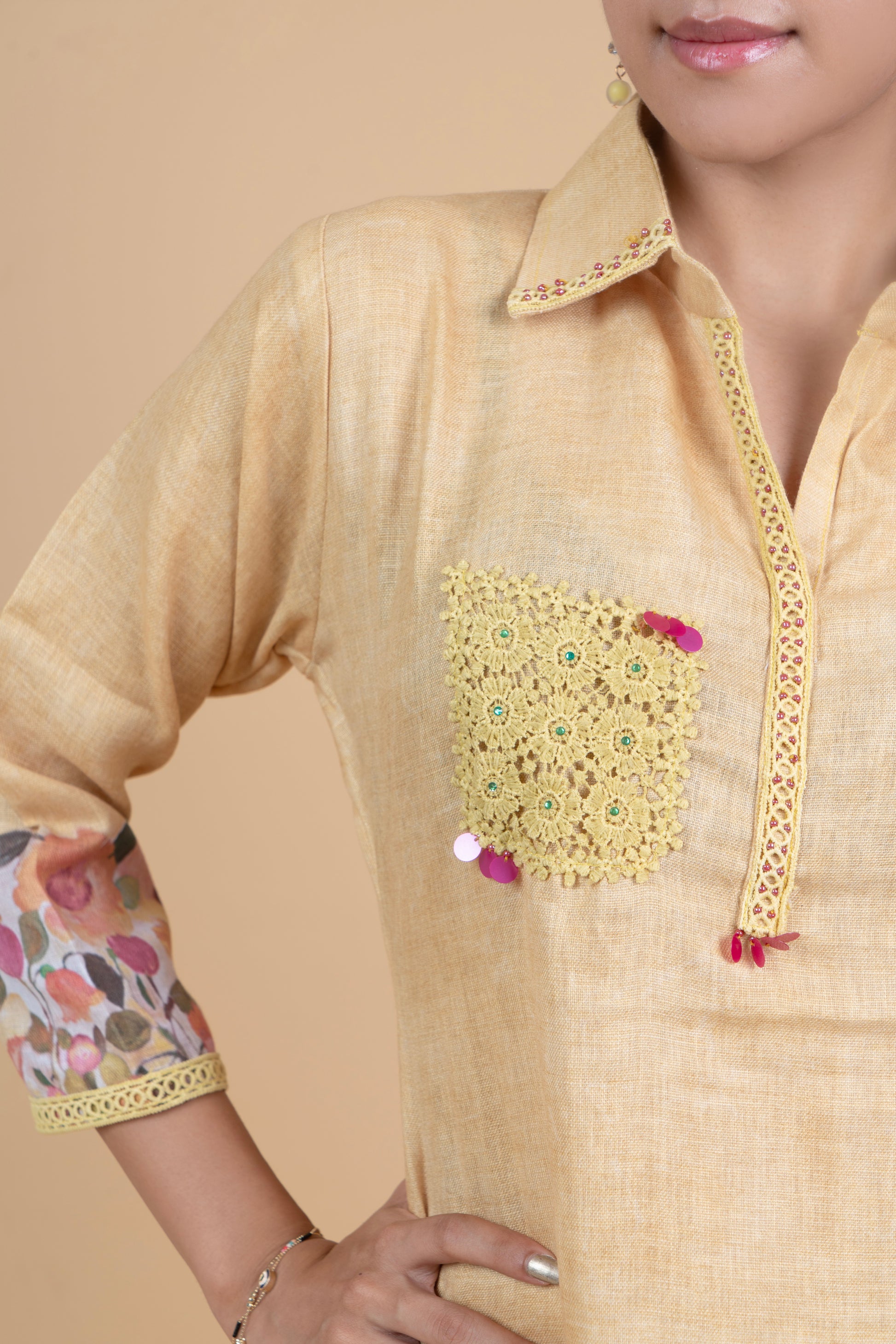 Mustard yellow collared kurta set with crochet lace pocket detail, sequin highlights, floral printed hemline & sleeve cuffs, and lace-trim neckline. Paired with matching slim pants for a chic ethnic-fusion look.