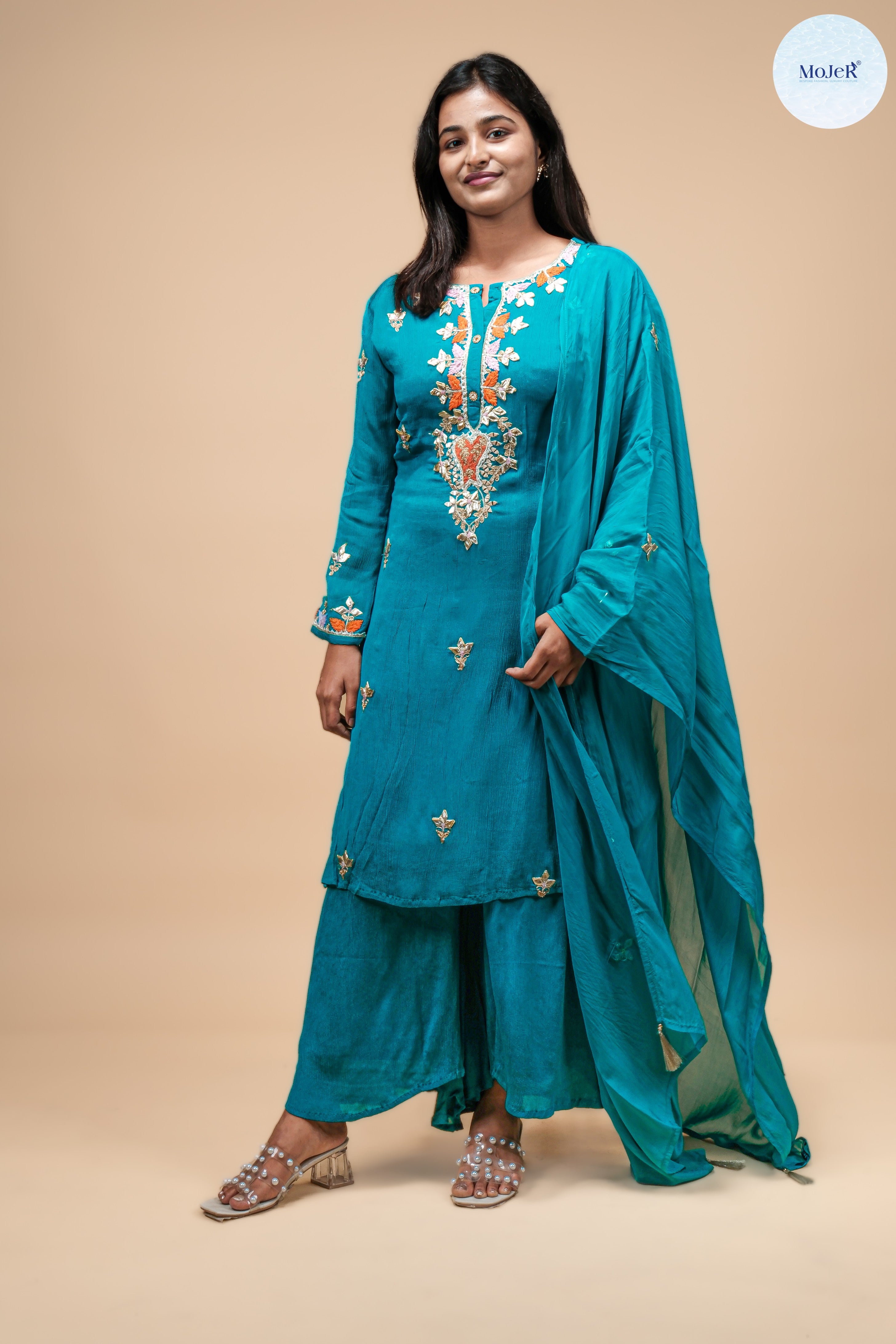 Teal Blue Embroidered Kurta Set with Sharara Pants