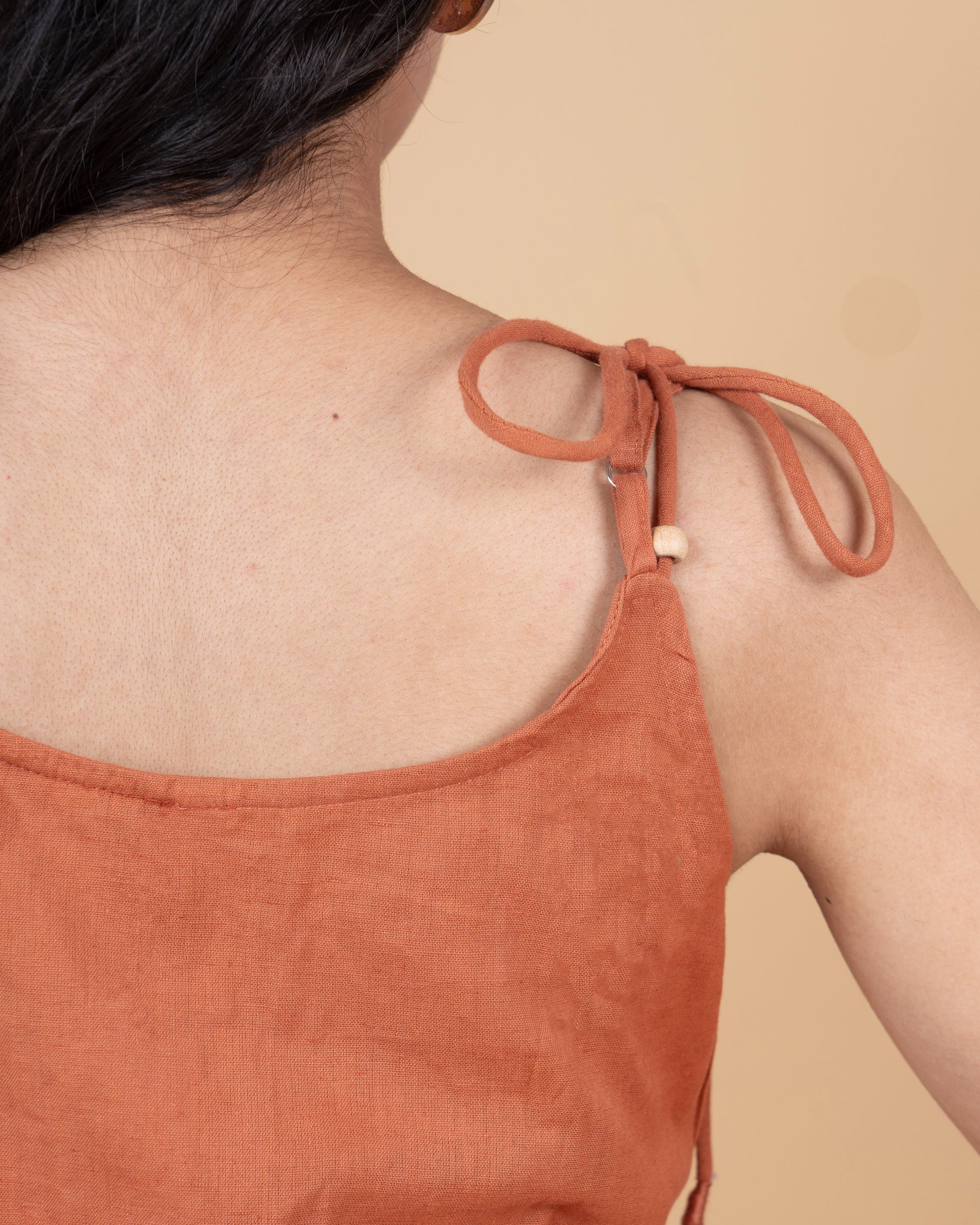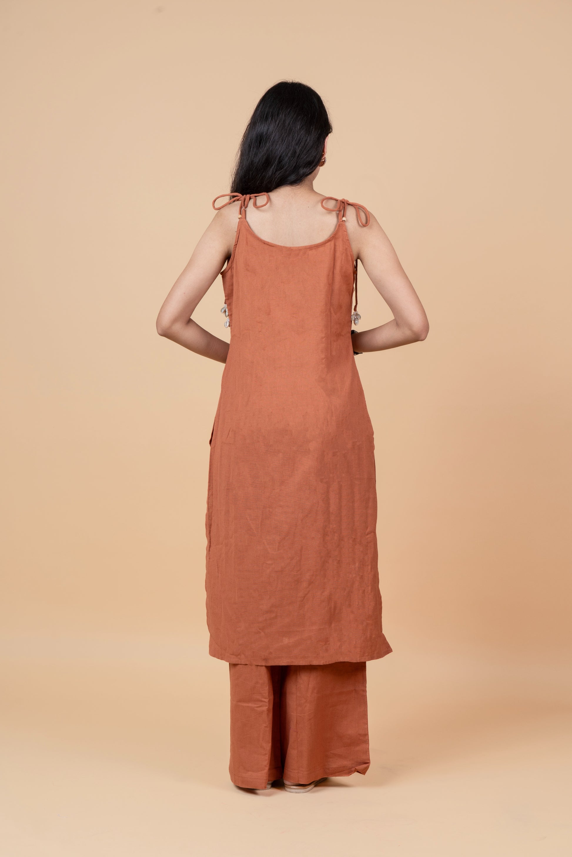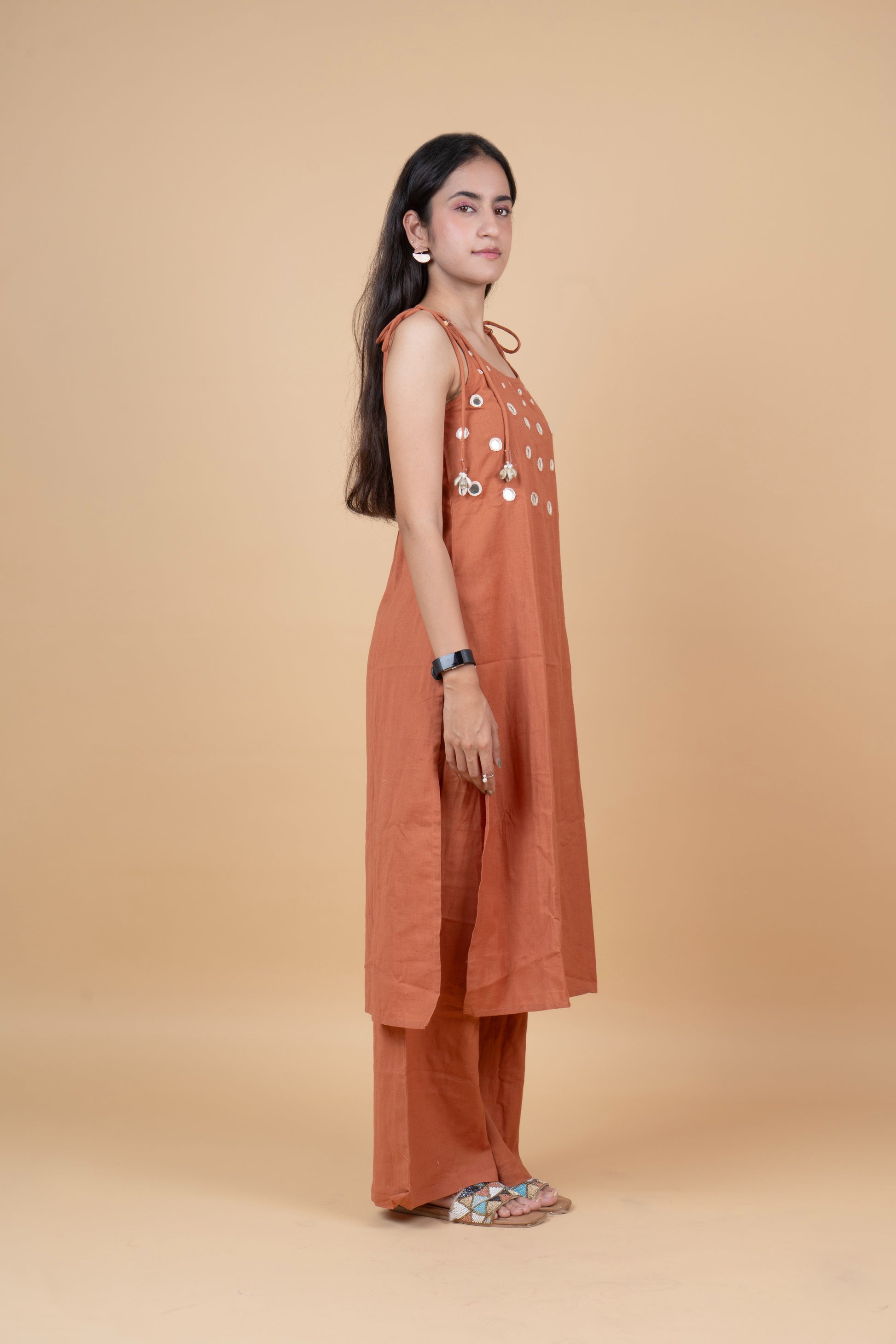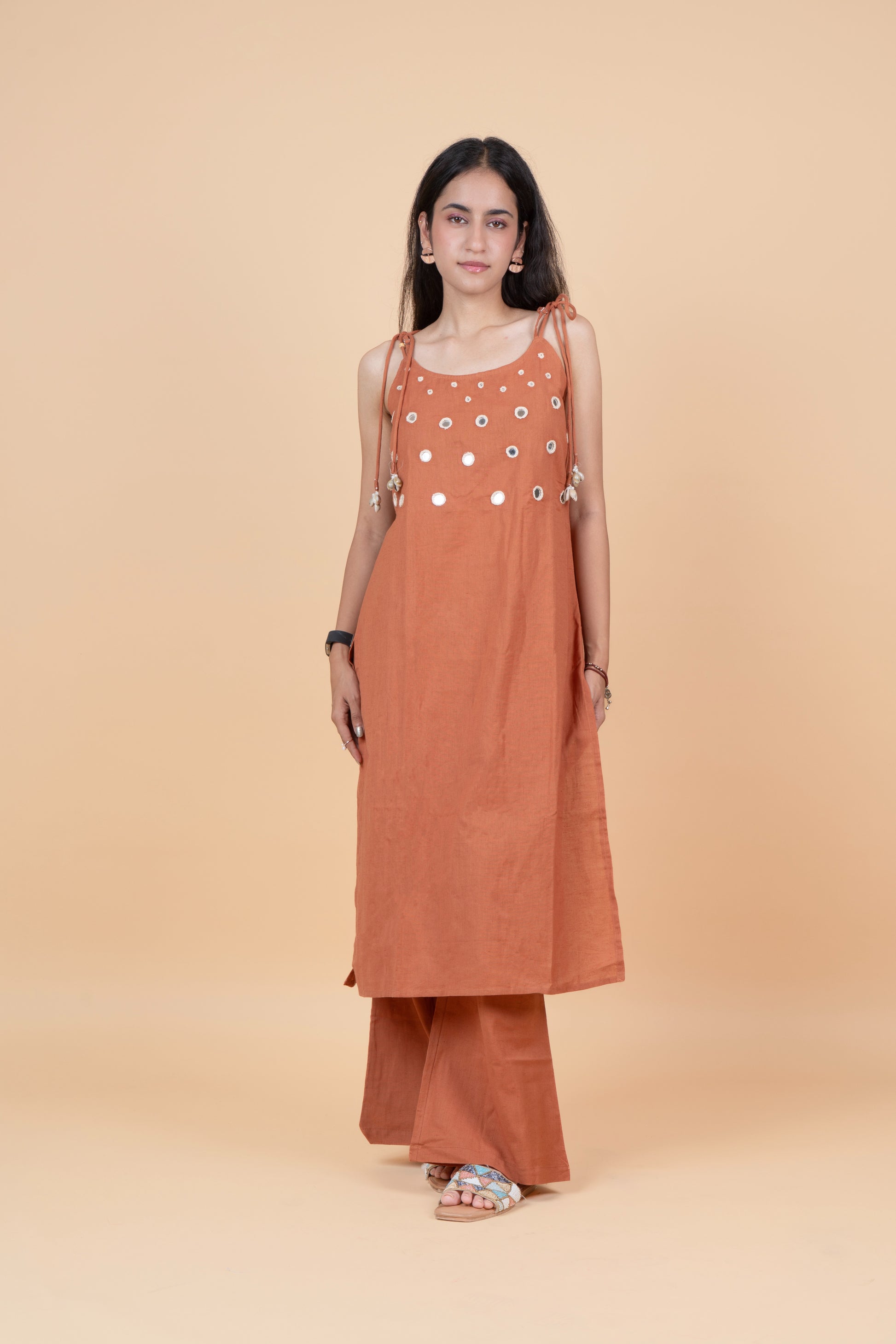 Elegant rust-orange strappy kurta set with mirror embroidery and shell tie details. Paired with matching pants, this chic ethnic set is perfect for festive gatherings and casual outings.