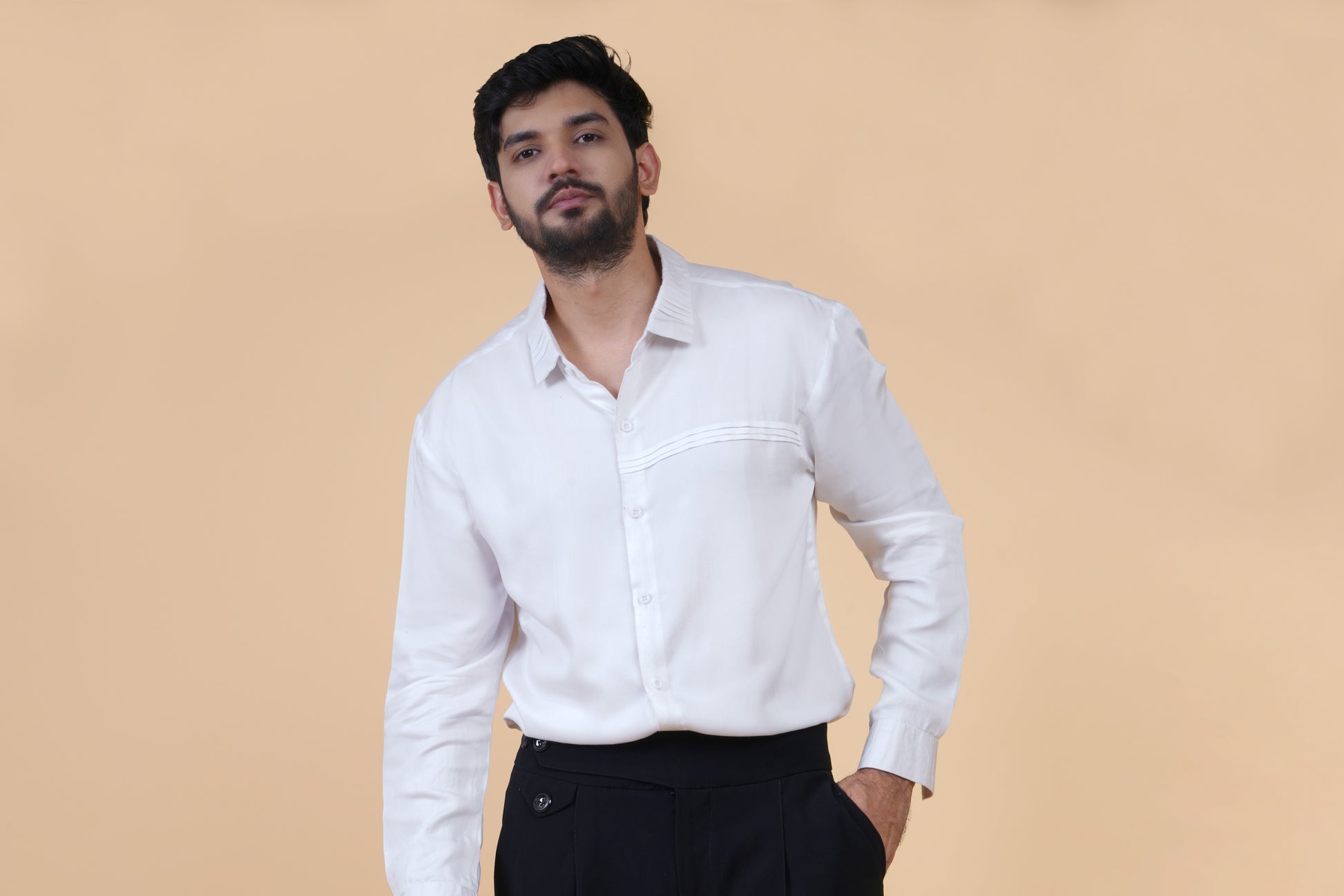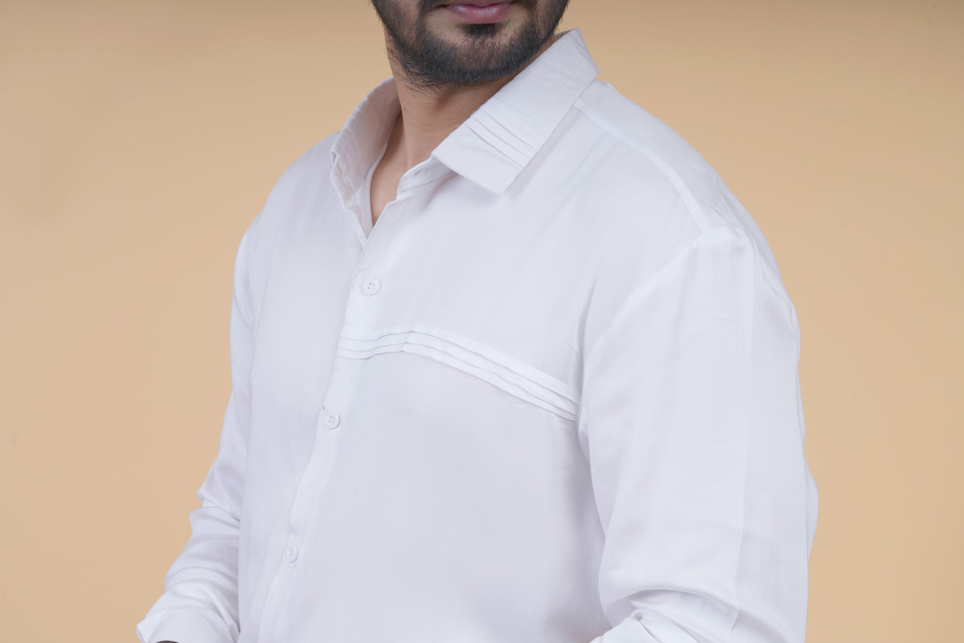 Elevate your wardrobe essentials with our Men's Classic White Textured Cotton Shirt. Crafted from premium cotton, this shirt features a minimal yet refined design with fine texture and delicate panel detailing on the chest. A perfect blend of comfort and sophistication for modern dressing.