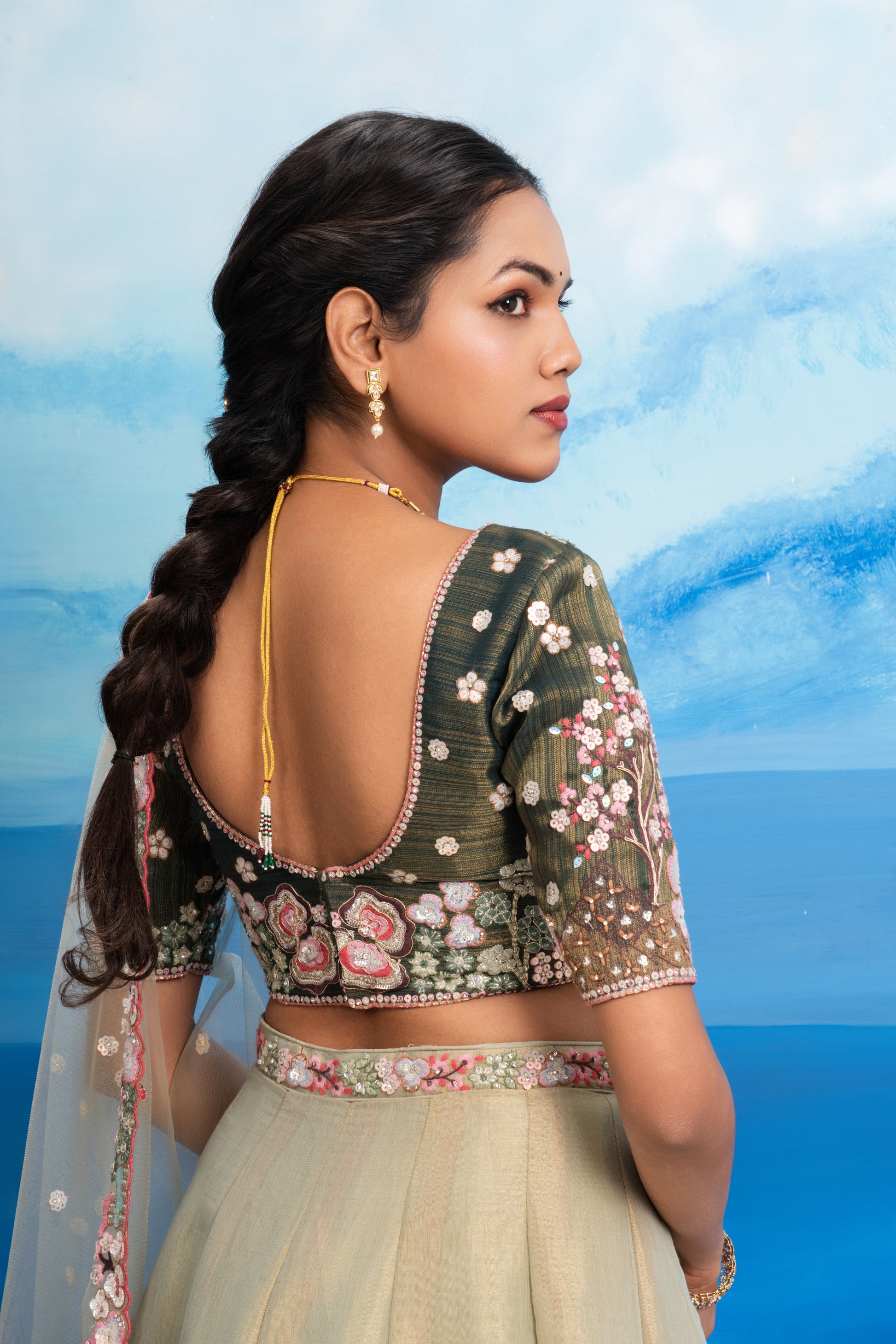 A graceful fusion lehenga crafted in rich raw silk, detailed with hand-embroidered floral motifs and elegant accents at the hemline. Designed in a timeless green palette, this lightweight yet luxurious silhouette is perfect for weddings, festive occasions, and celebrations. If you like the product, place an order right away. Our team will call you for customizations.
