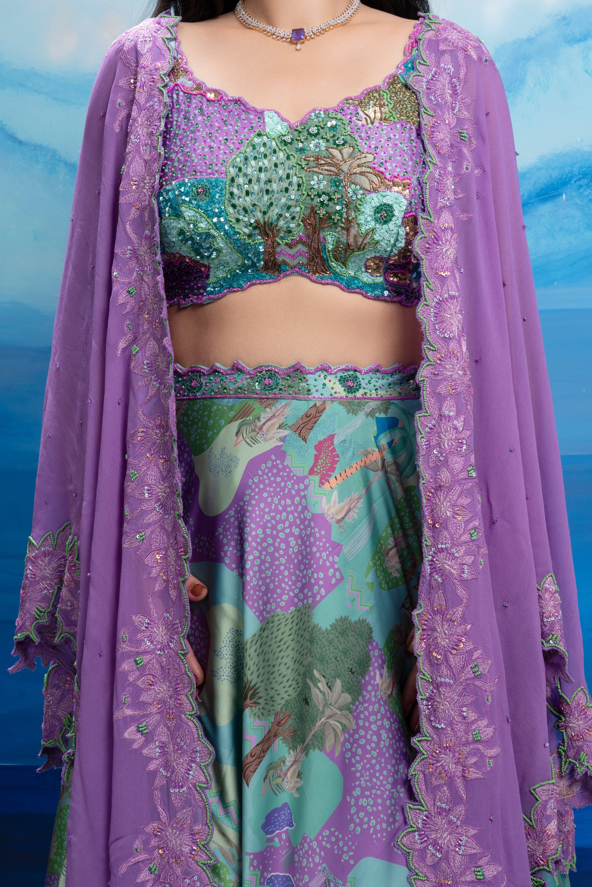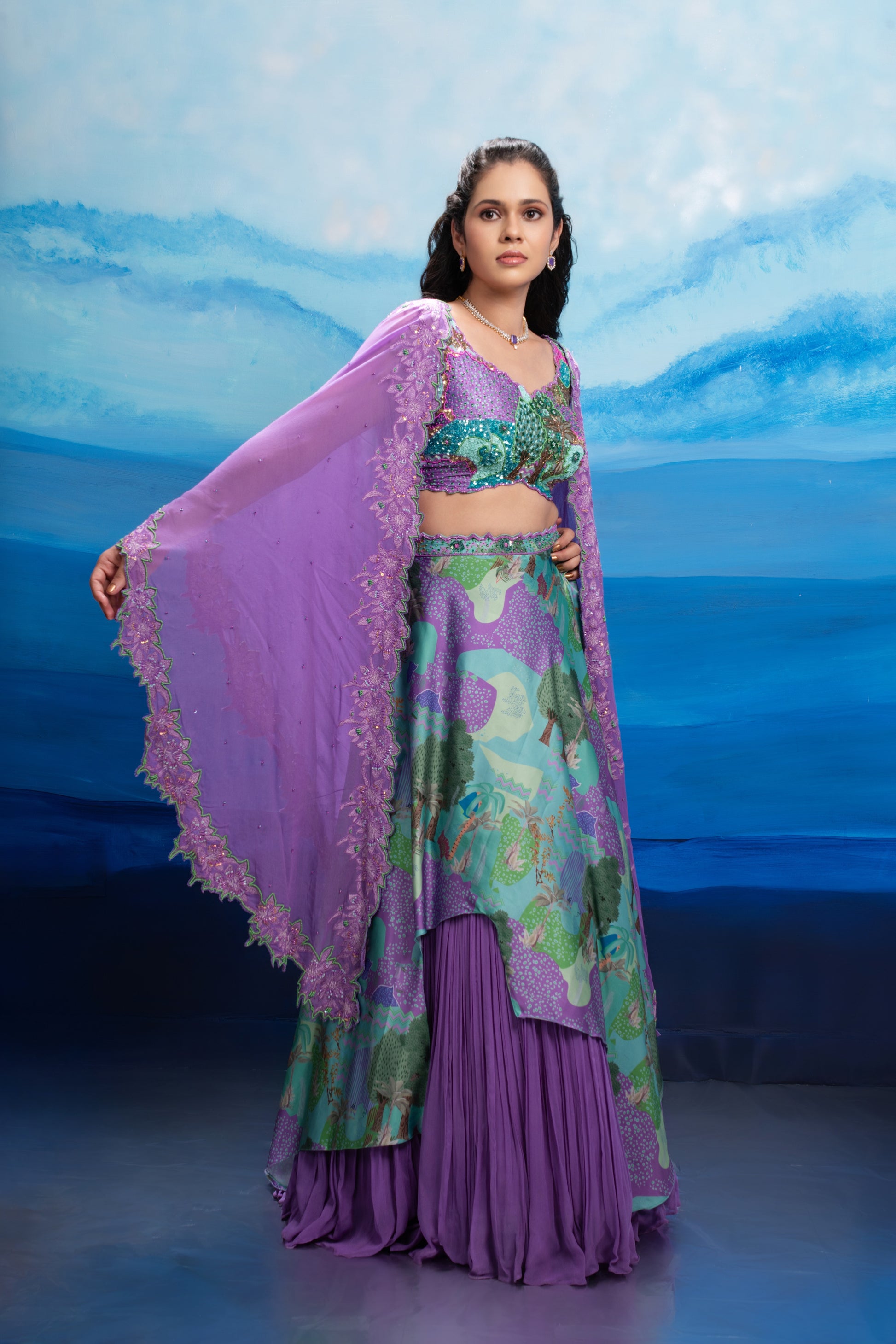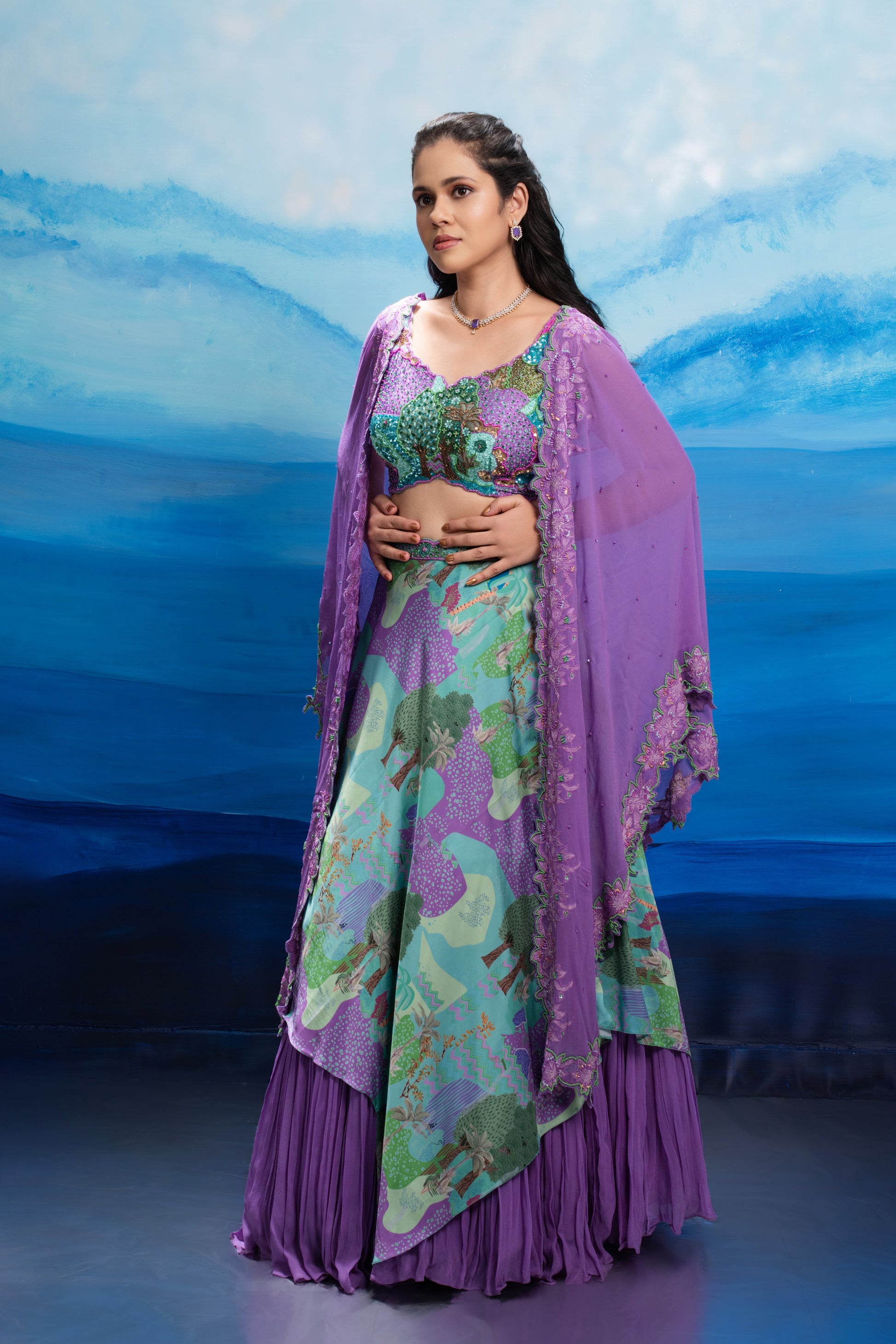 A premium unstitched lehenga set crafted in Italian satin crepe and georgette, featuring intricate hand embroidery and sequin-enhanced cutwork on the flare. Artistic multicolour floral digital print brings a high-fashion couture feel. Can be tailored to any size with custom color options. Ideal for weddings, receptions, festive evenings, bridal family and cocktail celebrations. Dry clean only. If you like the product, place an order right away. Our team will call you for customizations.