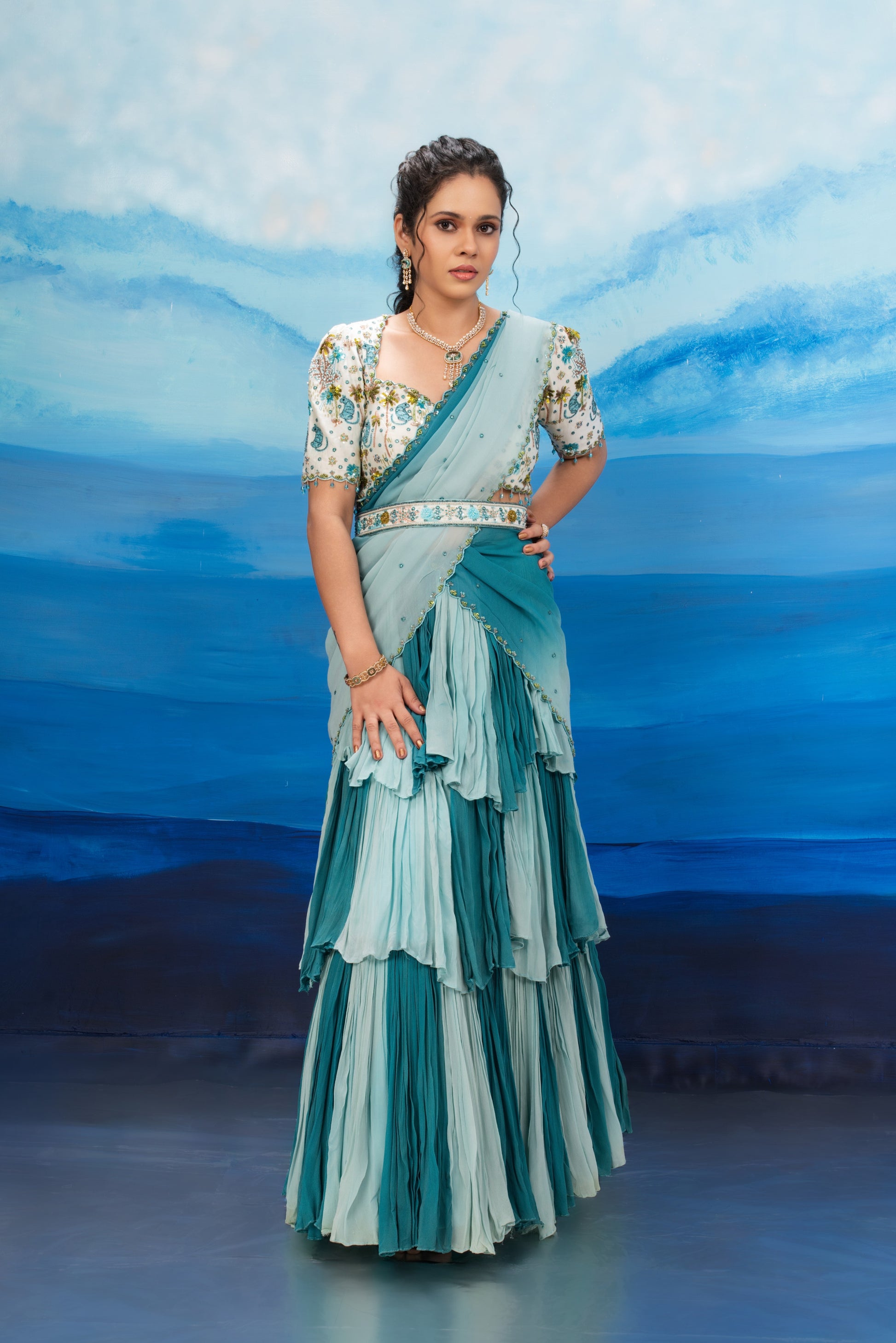 Taarini is a premium designer lehenga crafted in lightweight, layered georgette for effortless movement and elegance. The blouse features detailed hand embroidery with metallic thread and sequin highlights, complemented by a statement embroidered waist belt. Paired with a matching georgette dupatta, this ensemble brings modern Indo-western flair with timeless couture craftsmanship perfect for celebrations that demand grace, comfort, and style. If you like the product, place an order right away. Our team will call you for customizations.