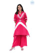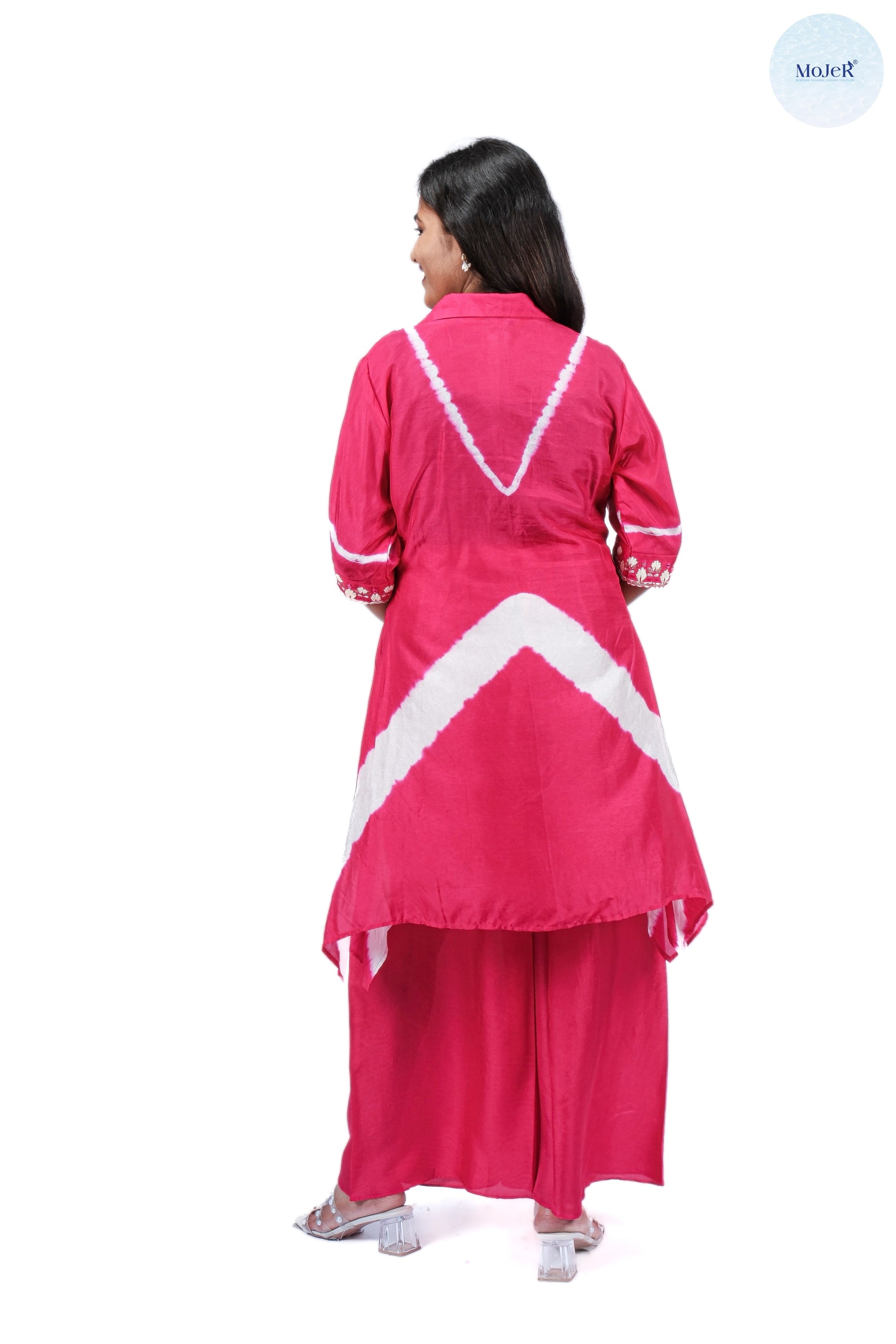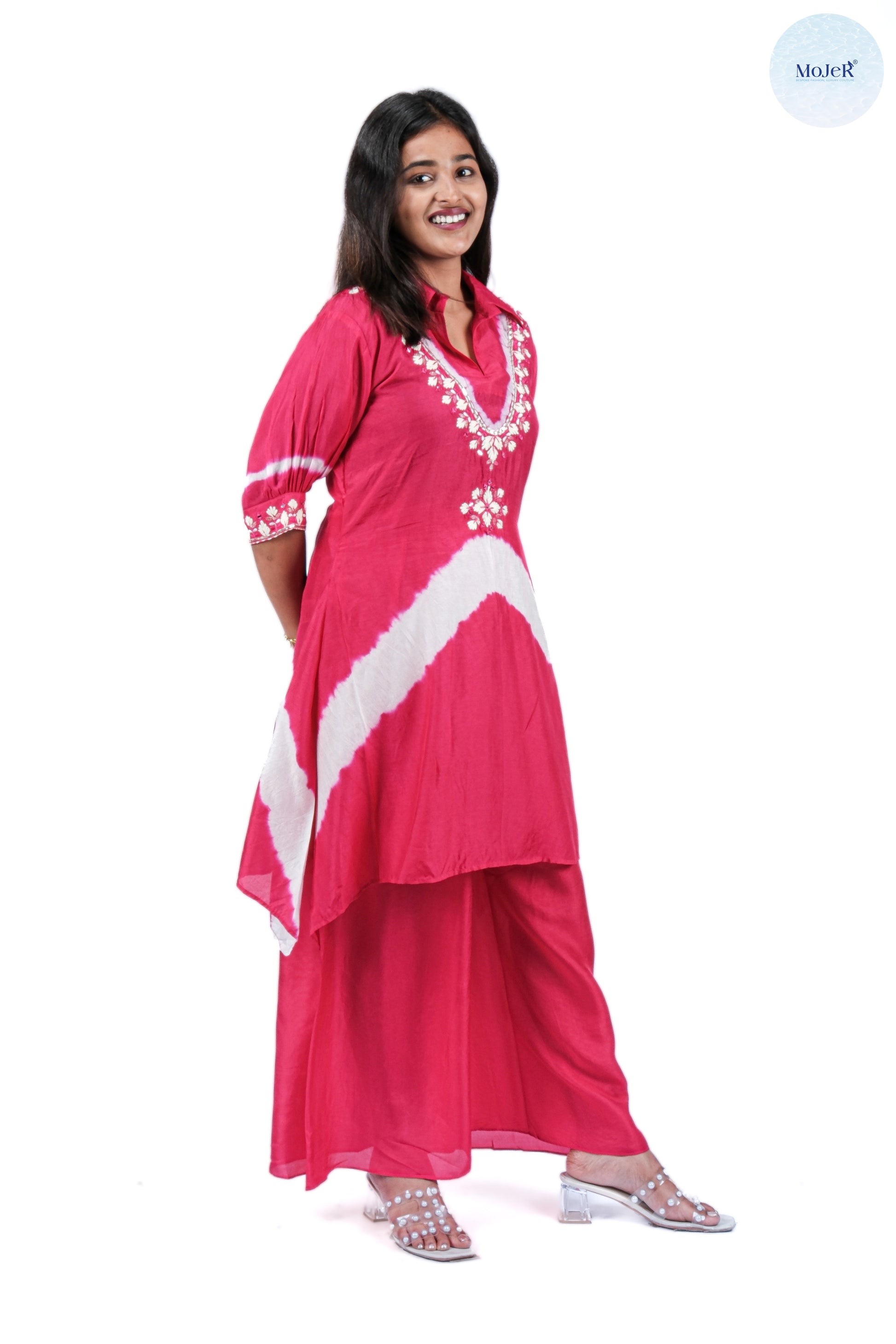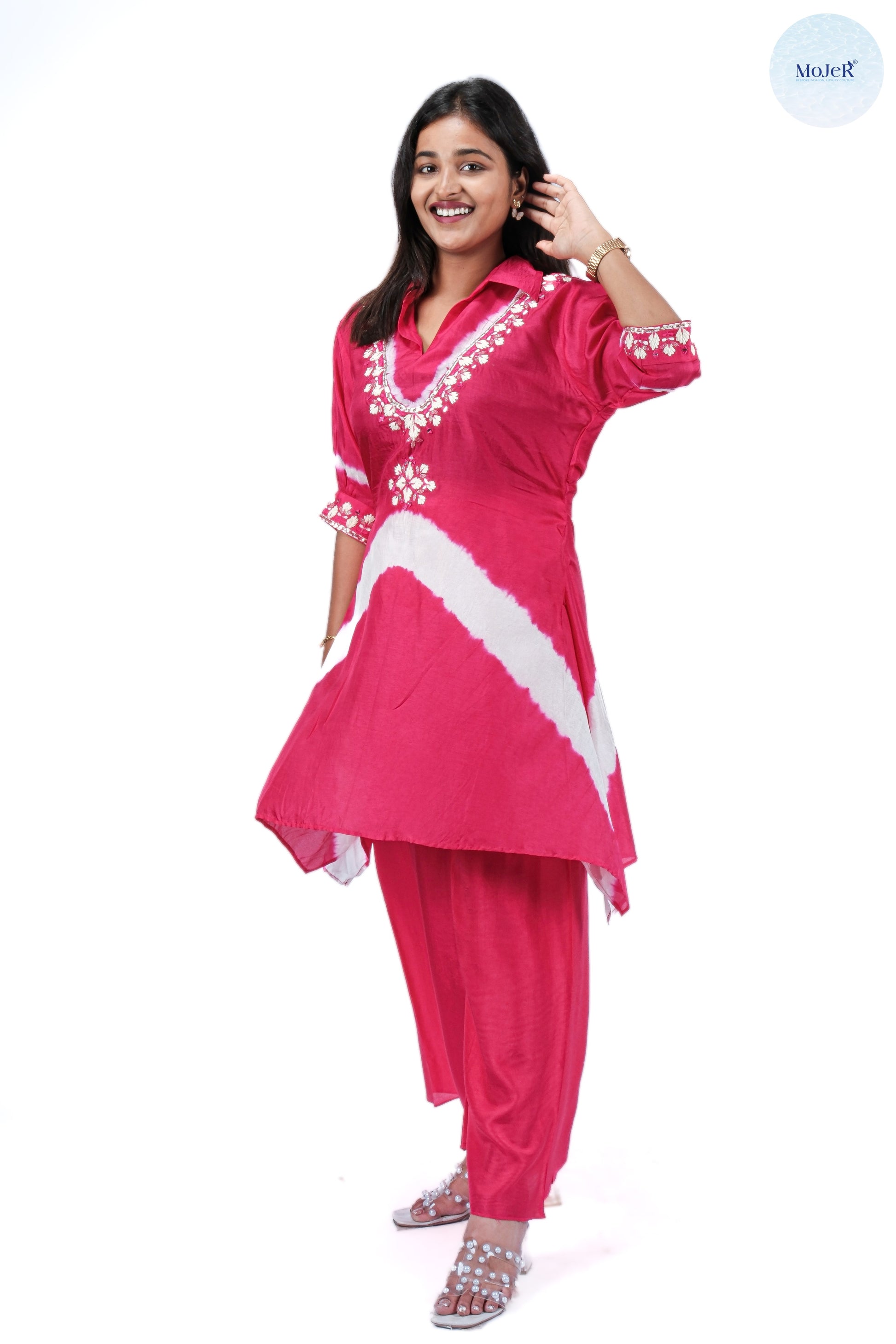 Beautiful Pink tie-dye kurta set with intricate white floral embroidery on the neckline and yoke. Paired with straight-fit pants for an elegant festive look.