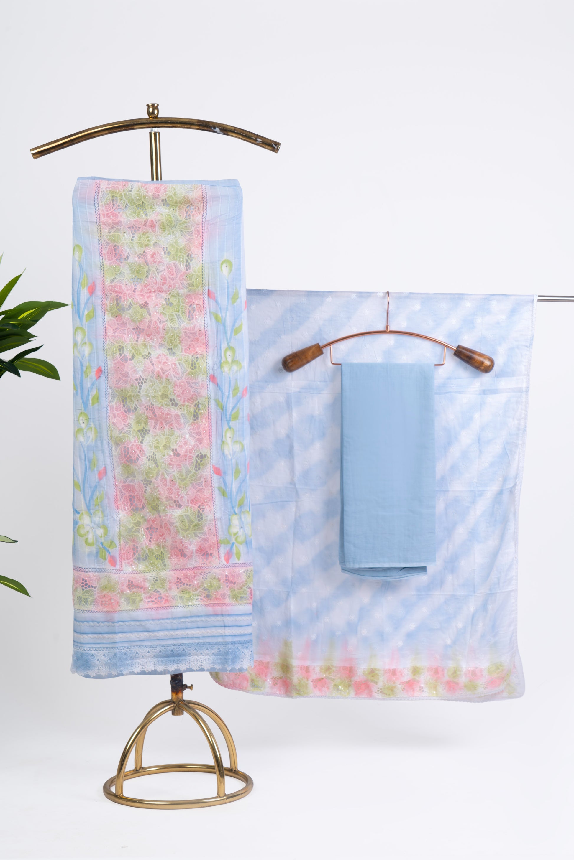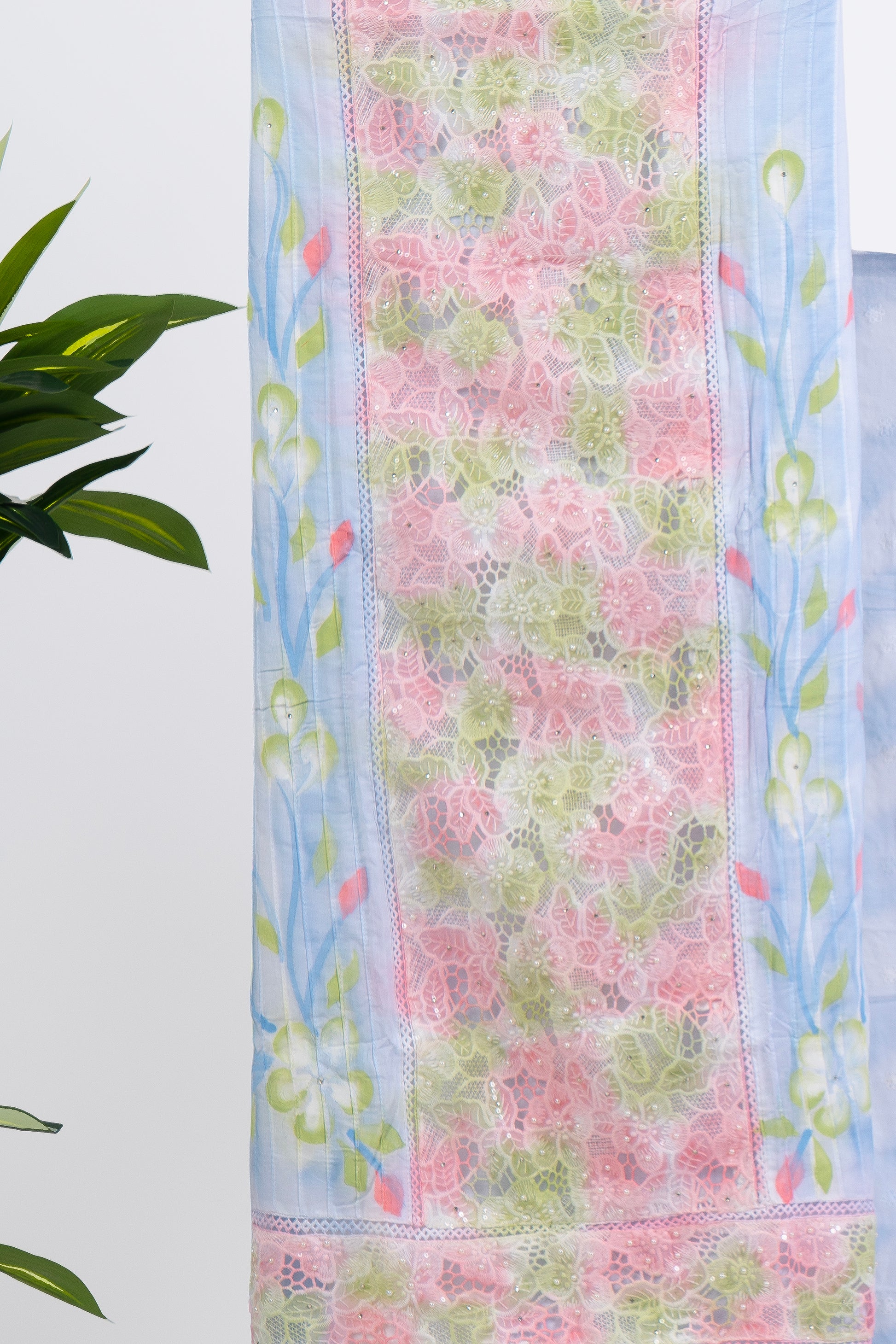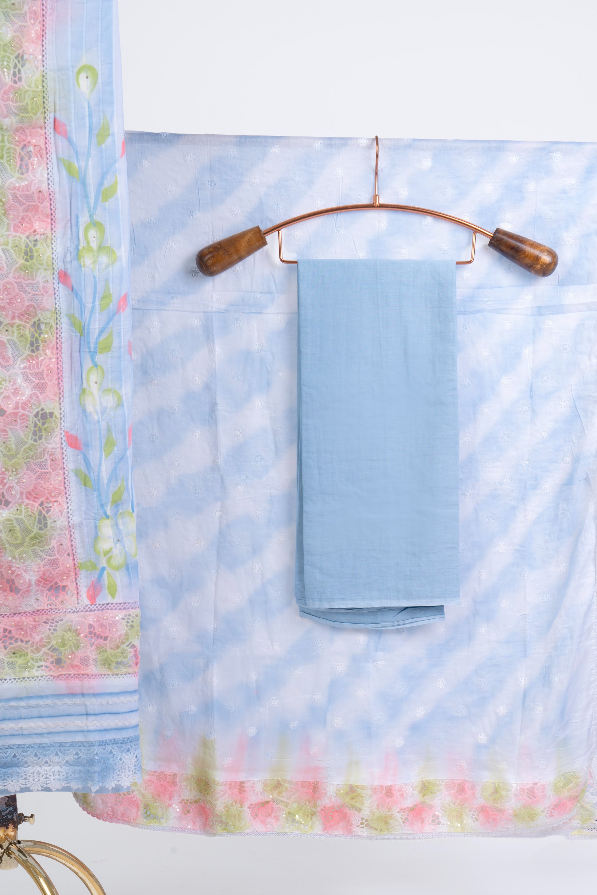 Hand Brush-Painted Sky Blue Suit Set with Intricate Cutwork & Crochet Hemline