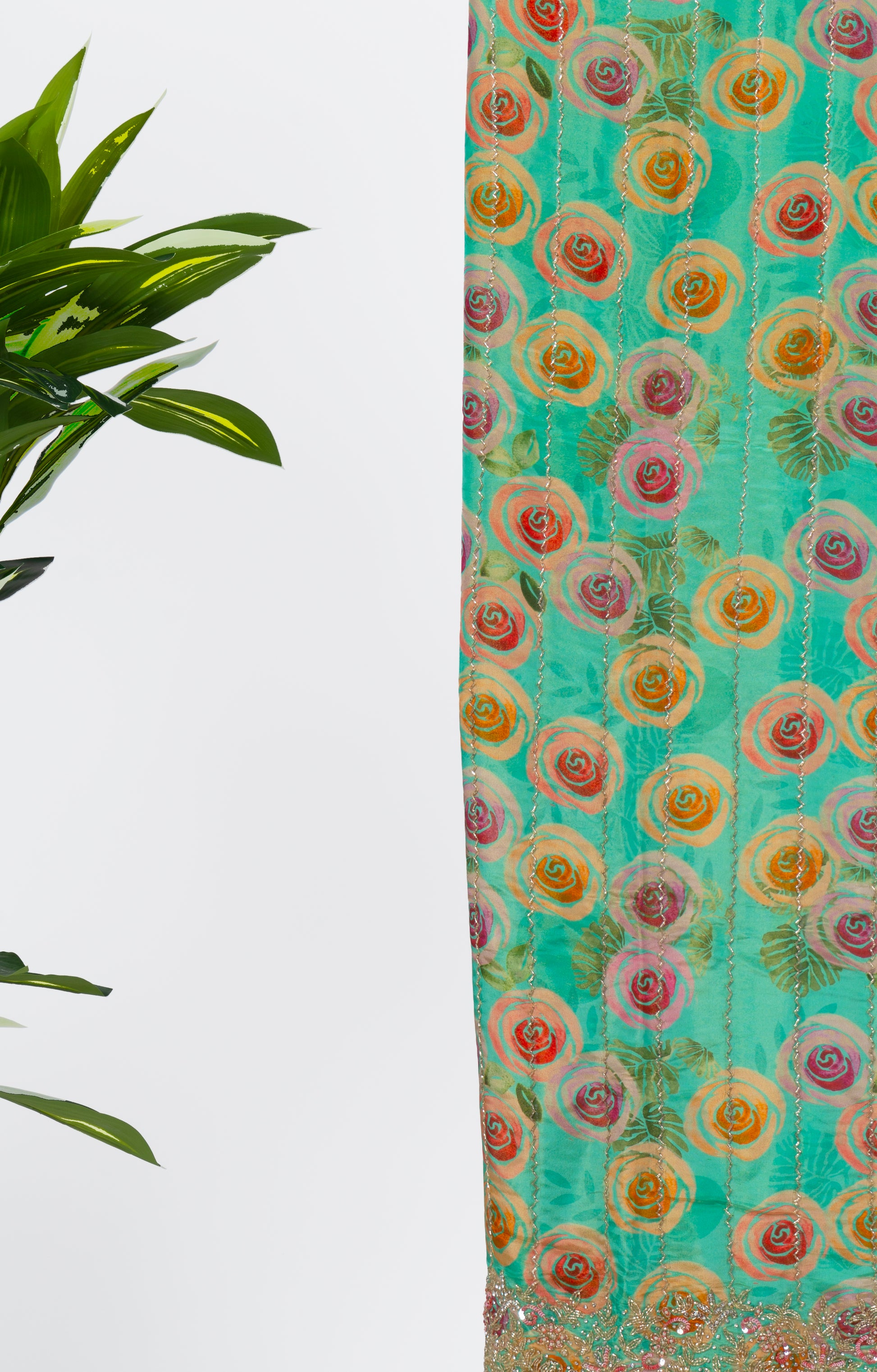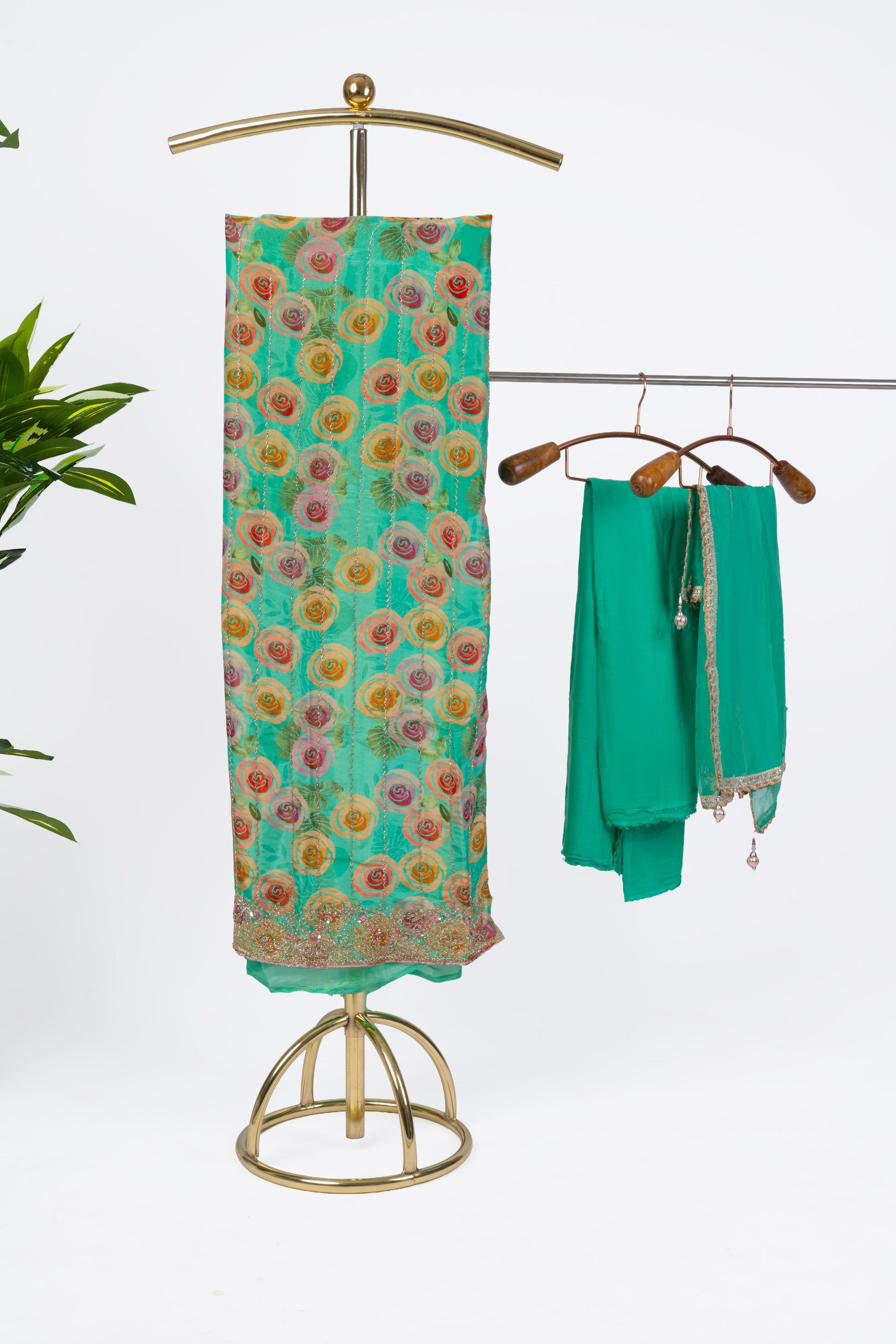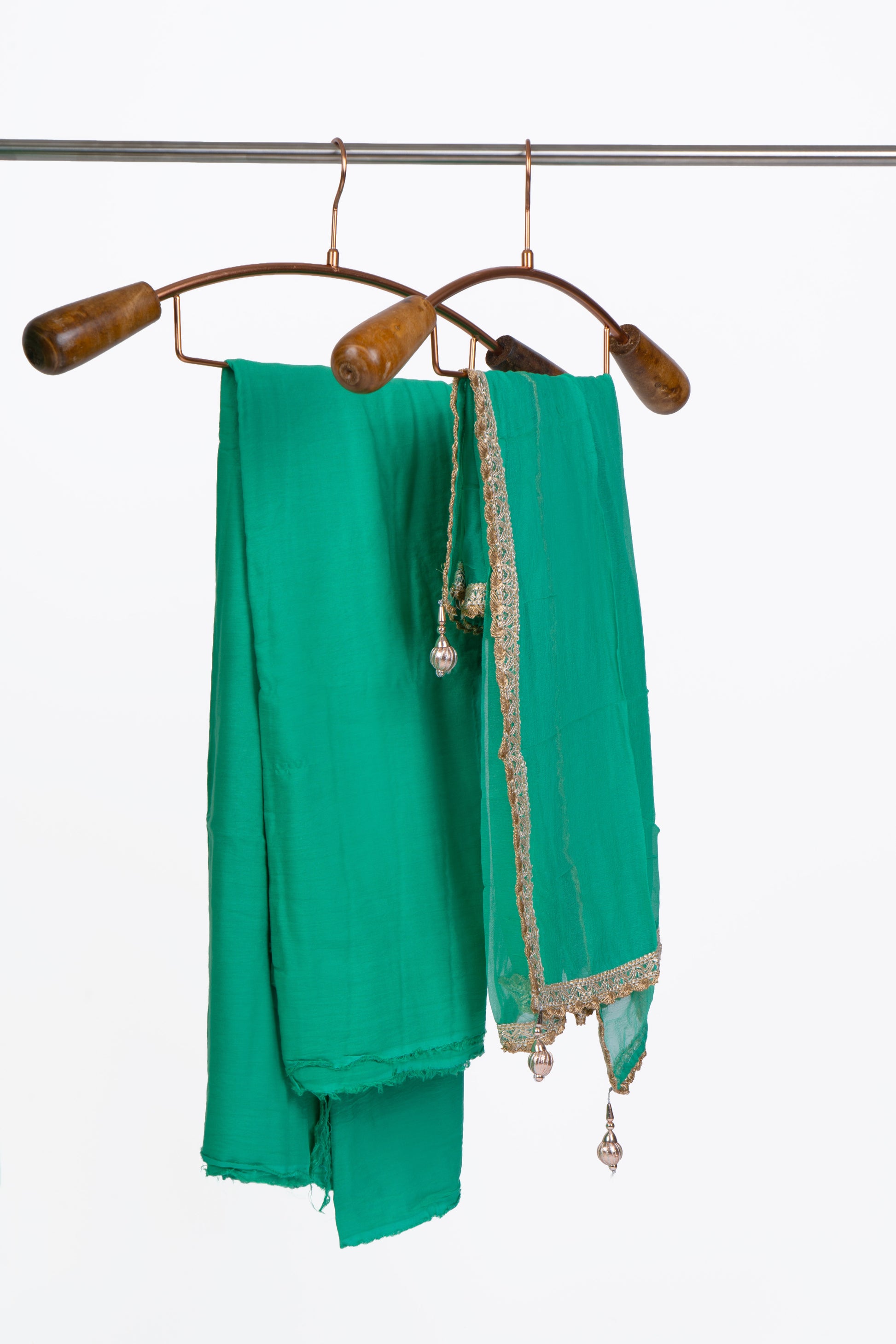 Hand-Embroidered Tissue Suit Set with Chiffon Dupatta - Green