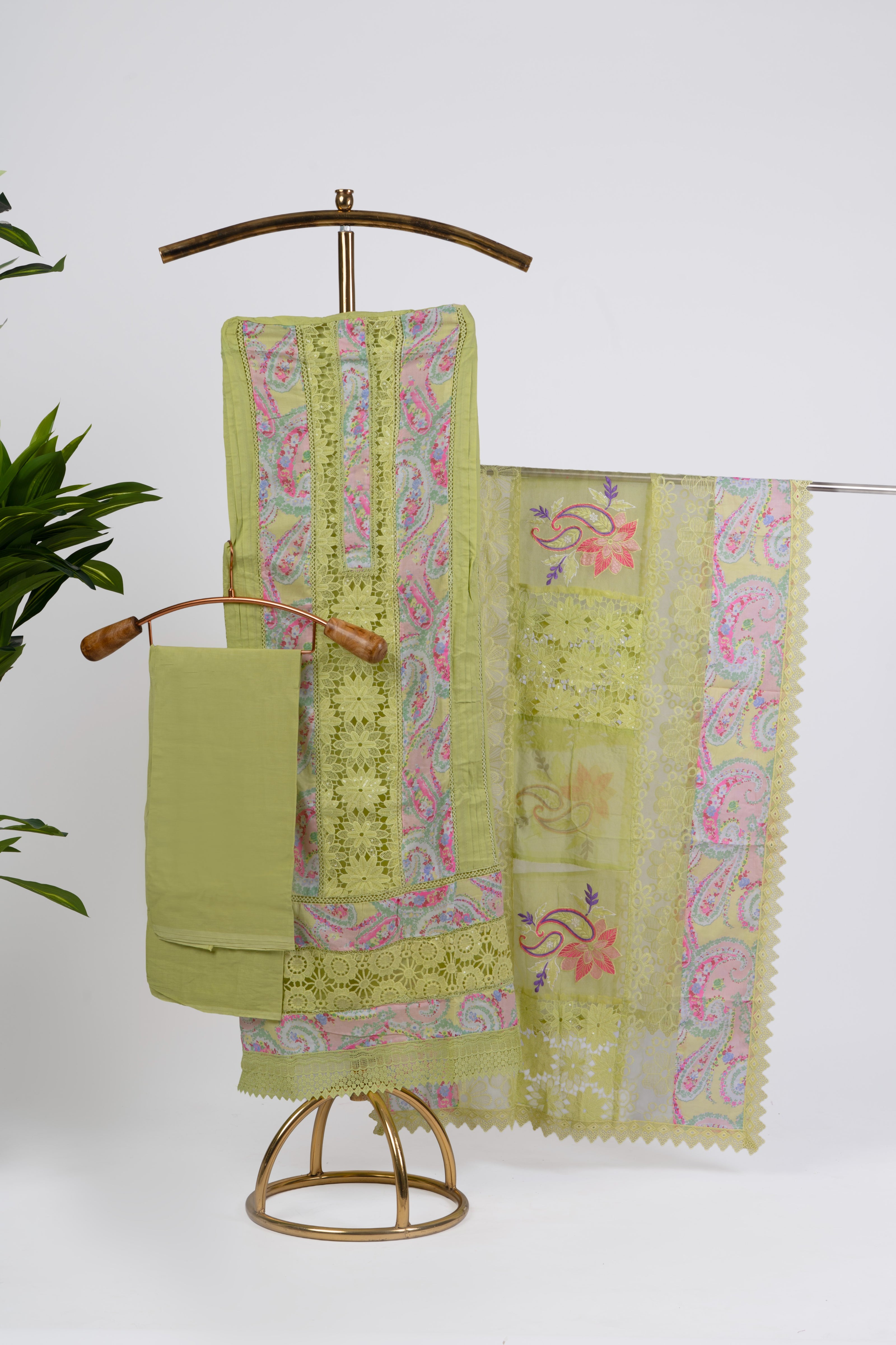 Green Floral Cutwork Cotton 3PC Unstitched Suit