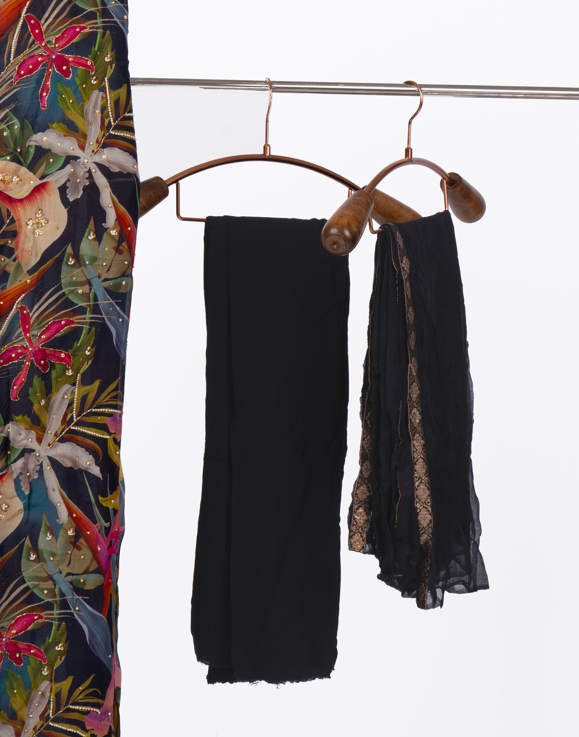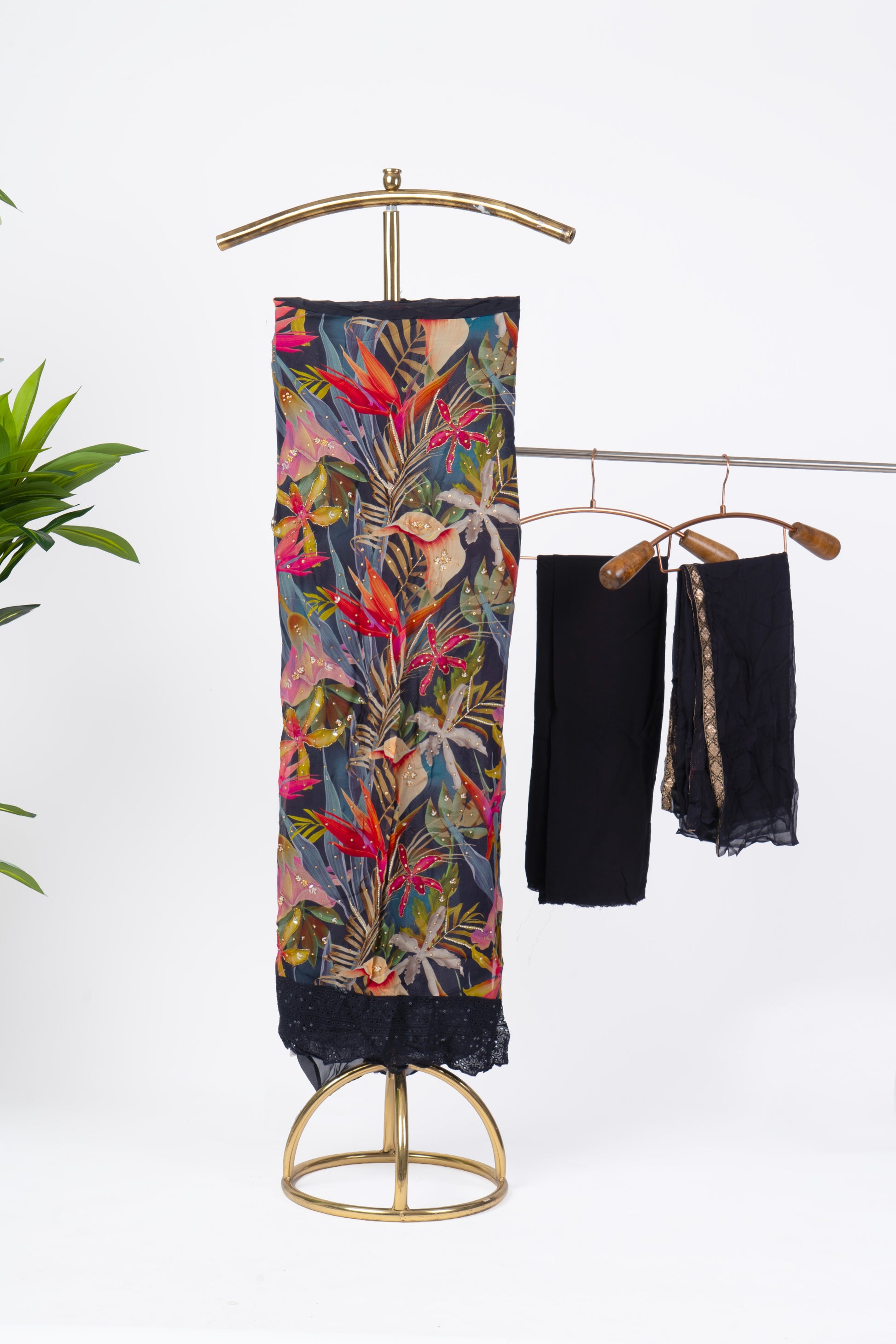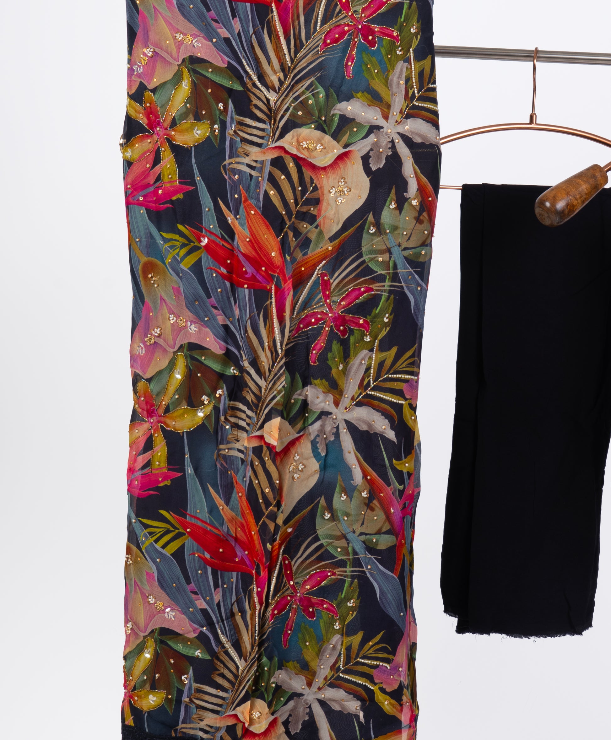 Floral Black Digital Print Suit Set with Lace Border