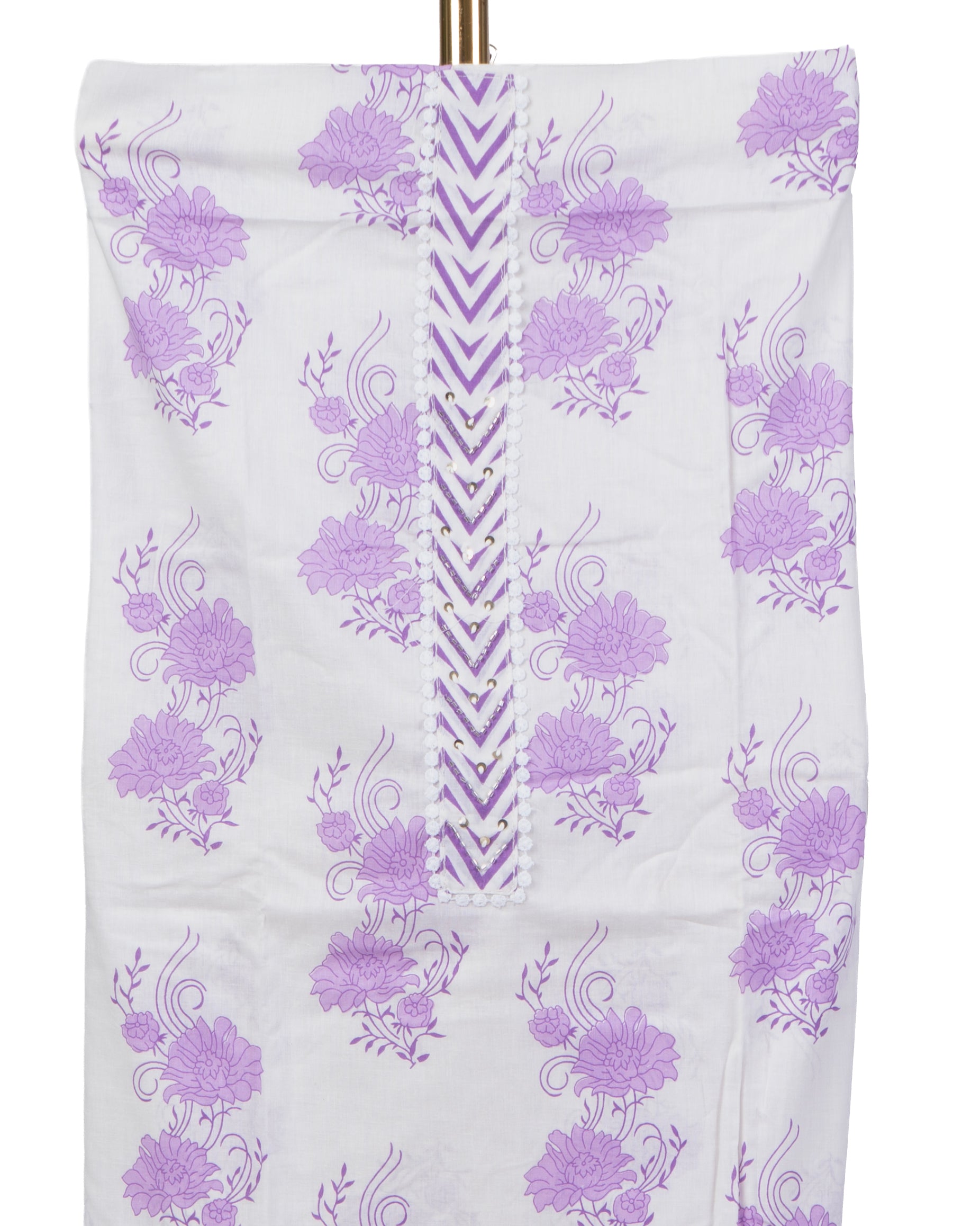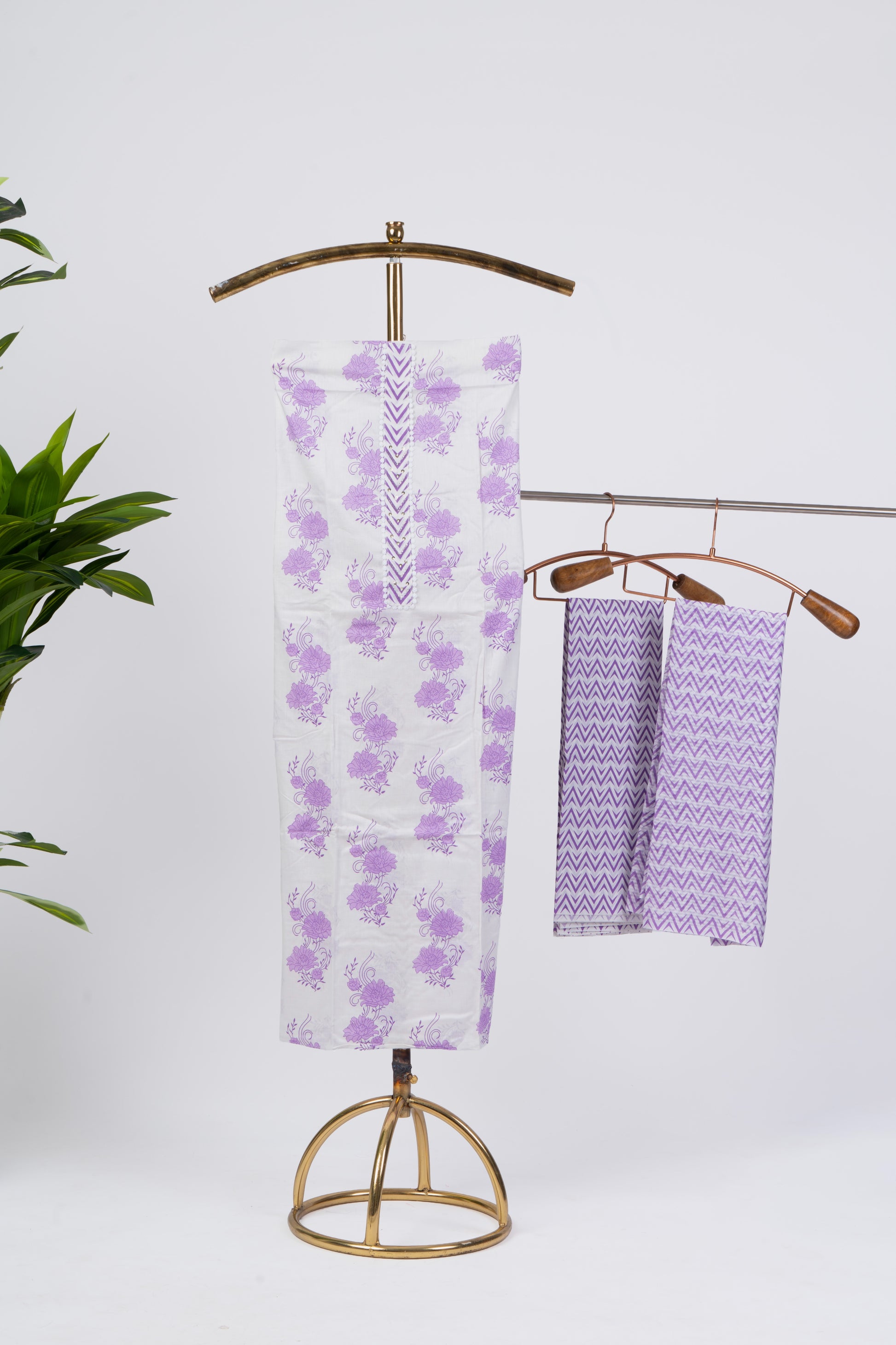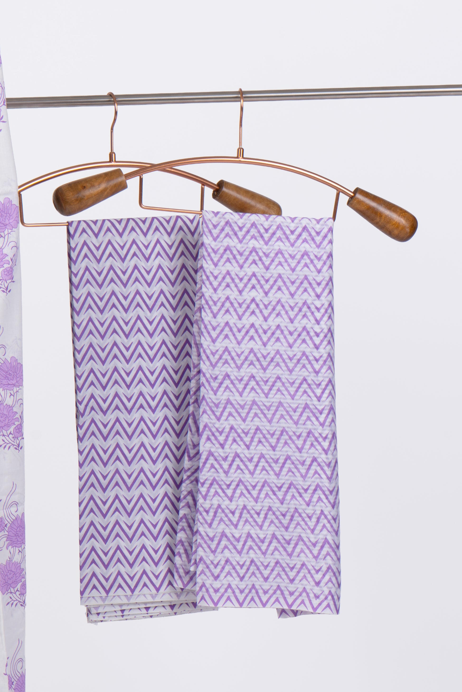 Bright and breezy Lilac cotton suit set with hand block-style floral printed top, chevron-printed bottom and matching dupatta. Ultra-soft summer-friendly cotton perfect for daily wear, office looks, brunch days and travel. Lightweight, breathable and cheerful.