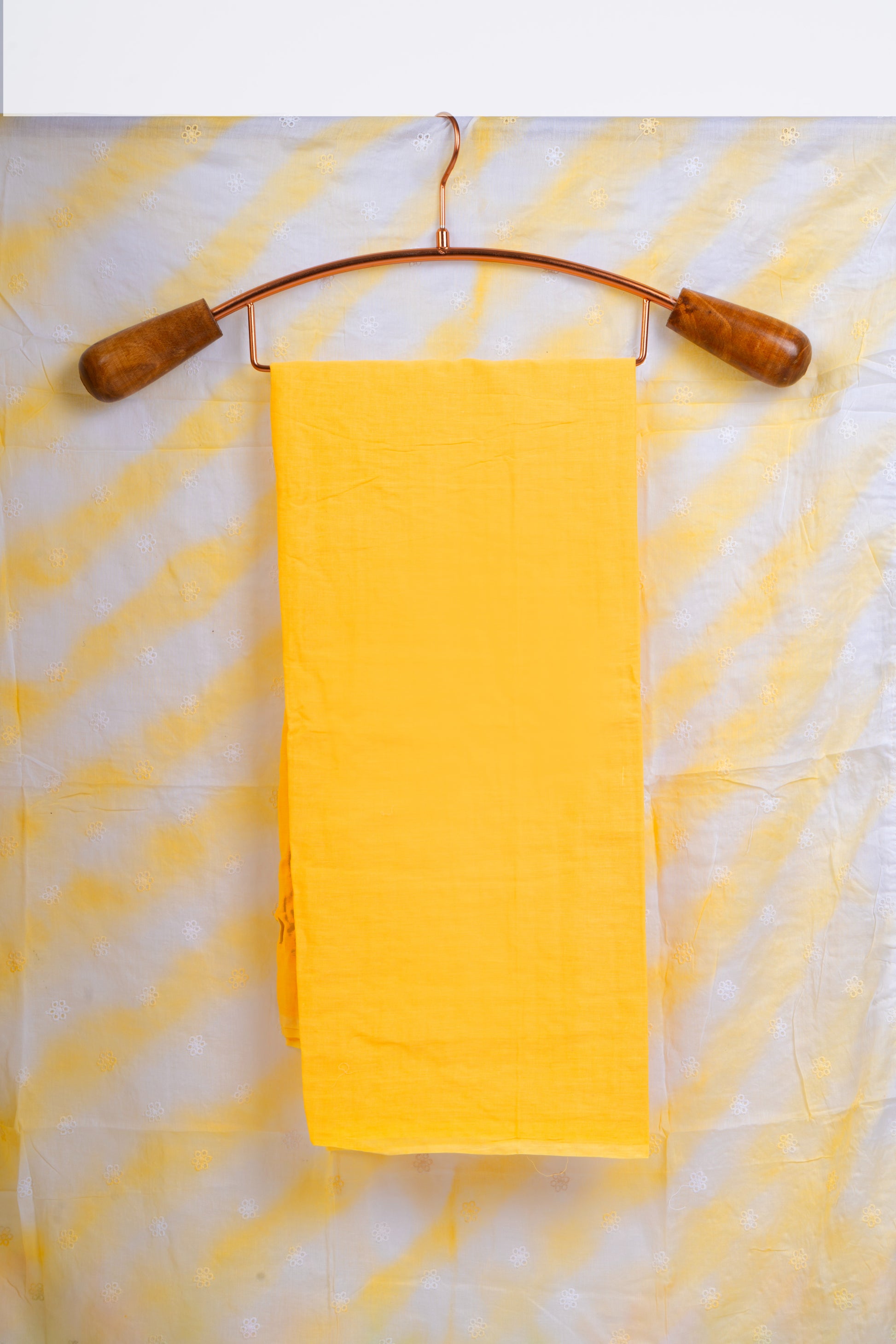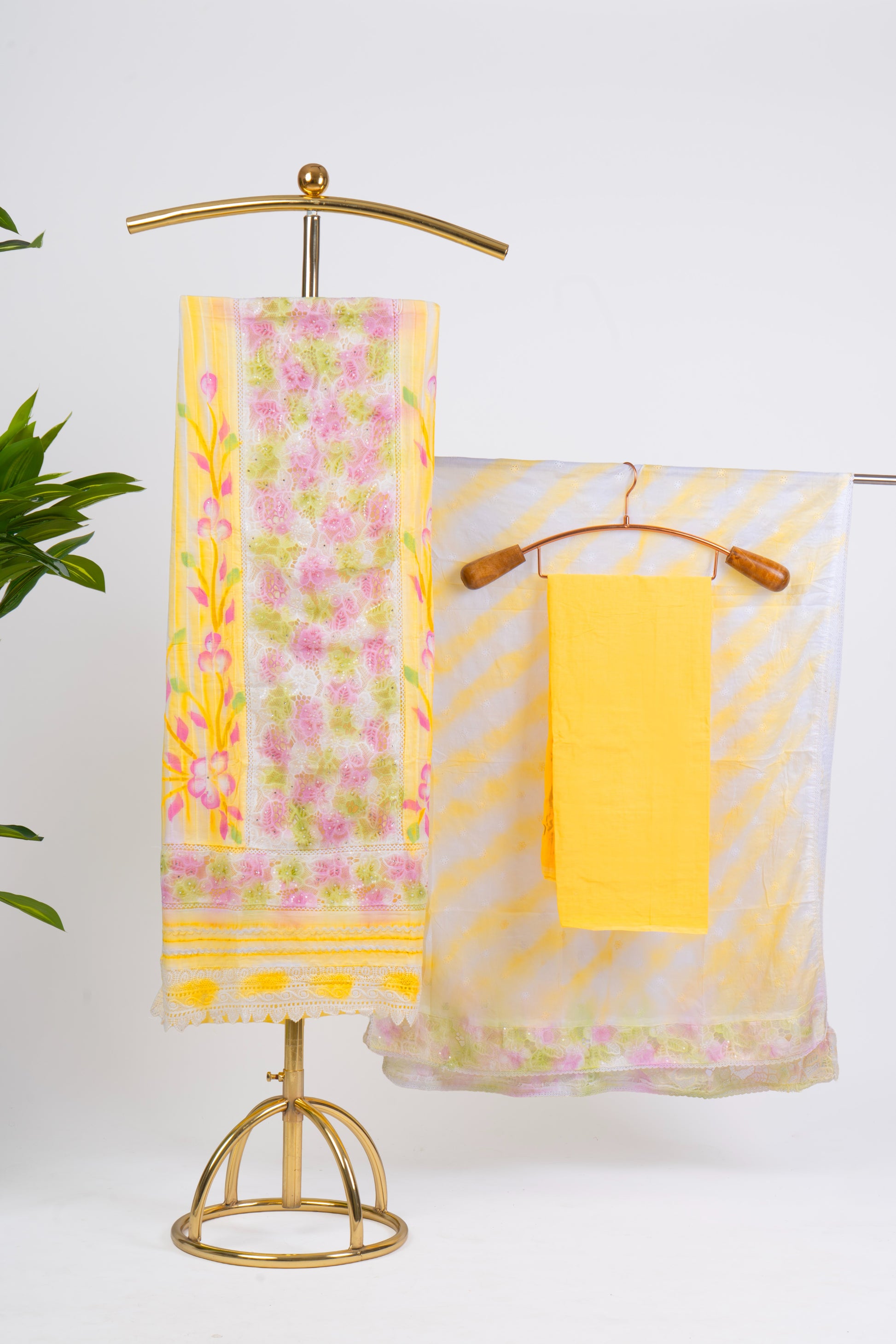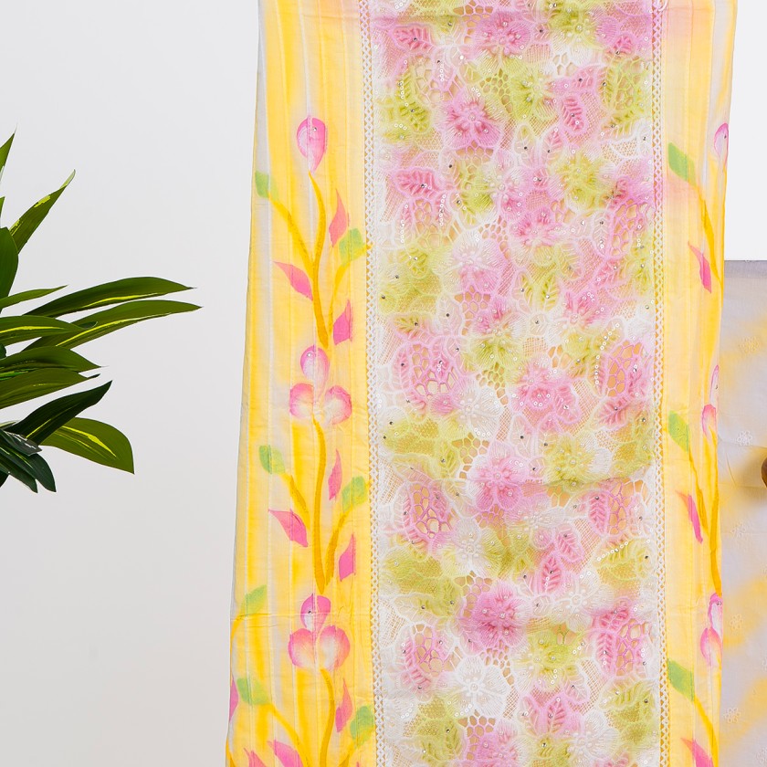 Hand Brush-Painted Yellow Suit Set with Intricate Cutwork & Crochet Hemline