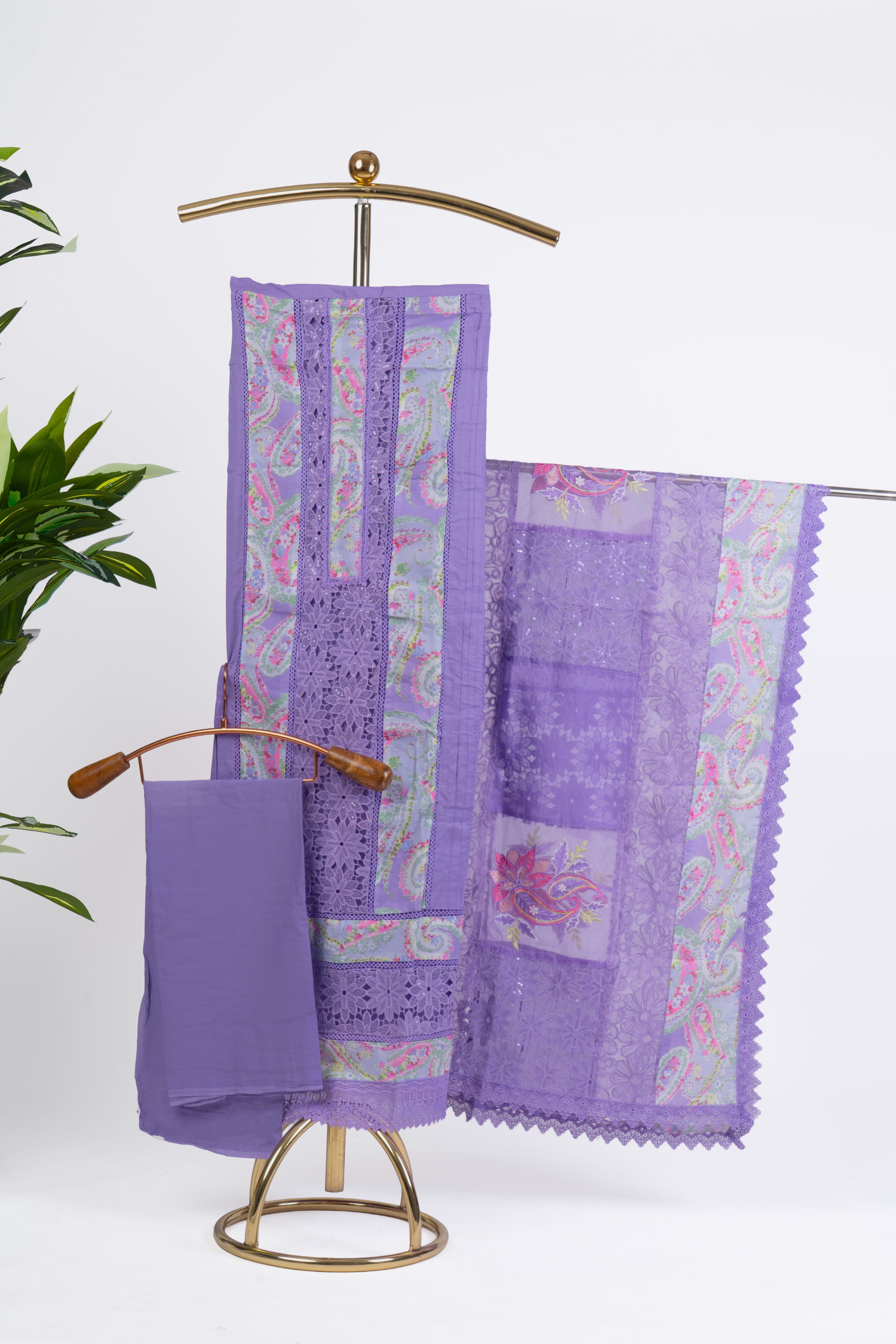 Lilac Floral Cutwork Cotton 3PC Unstitched Suit