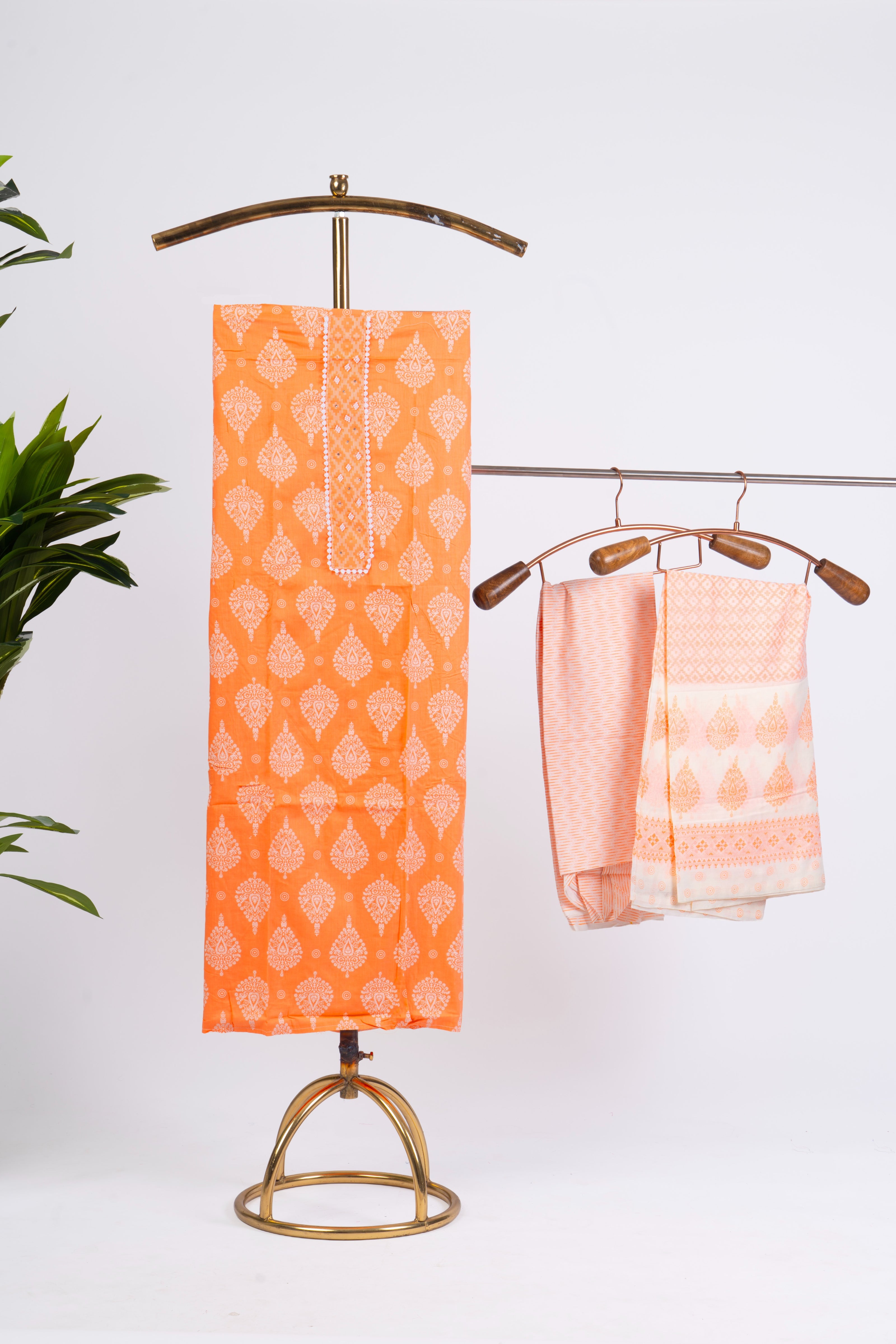 Hand-Embroidered Tissue Suit Set with Chiffon Dupatta - Orange