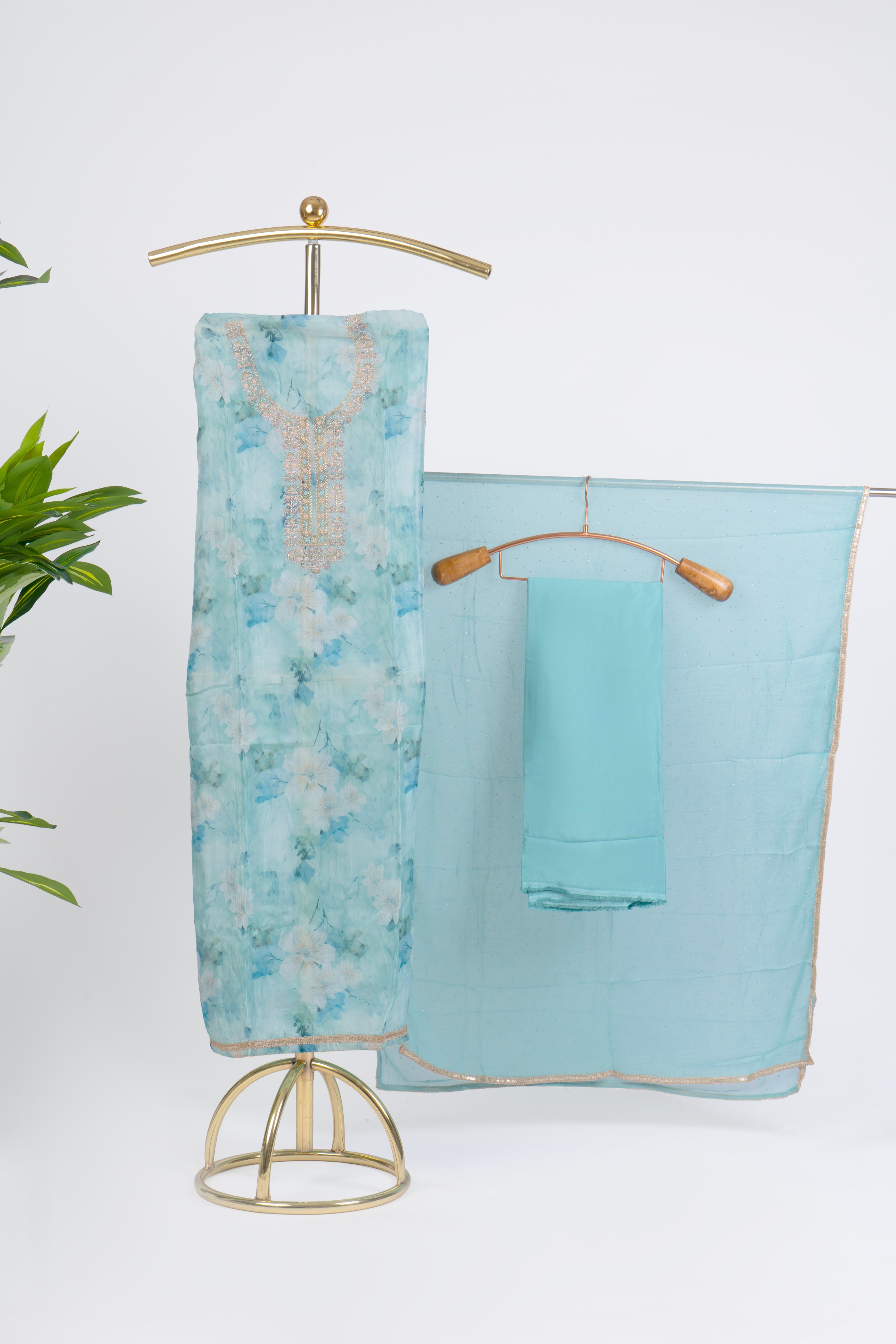 Soft Tissue Crepe Floral Suit Set with Hand Embroidery - Aqua Blue