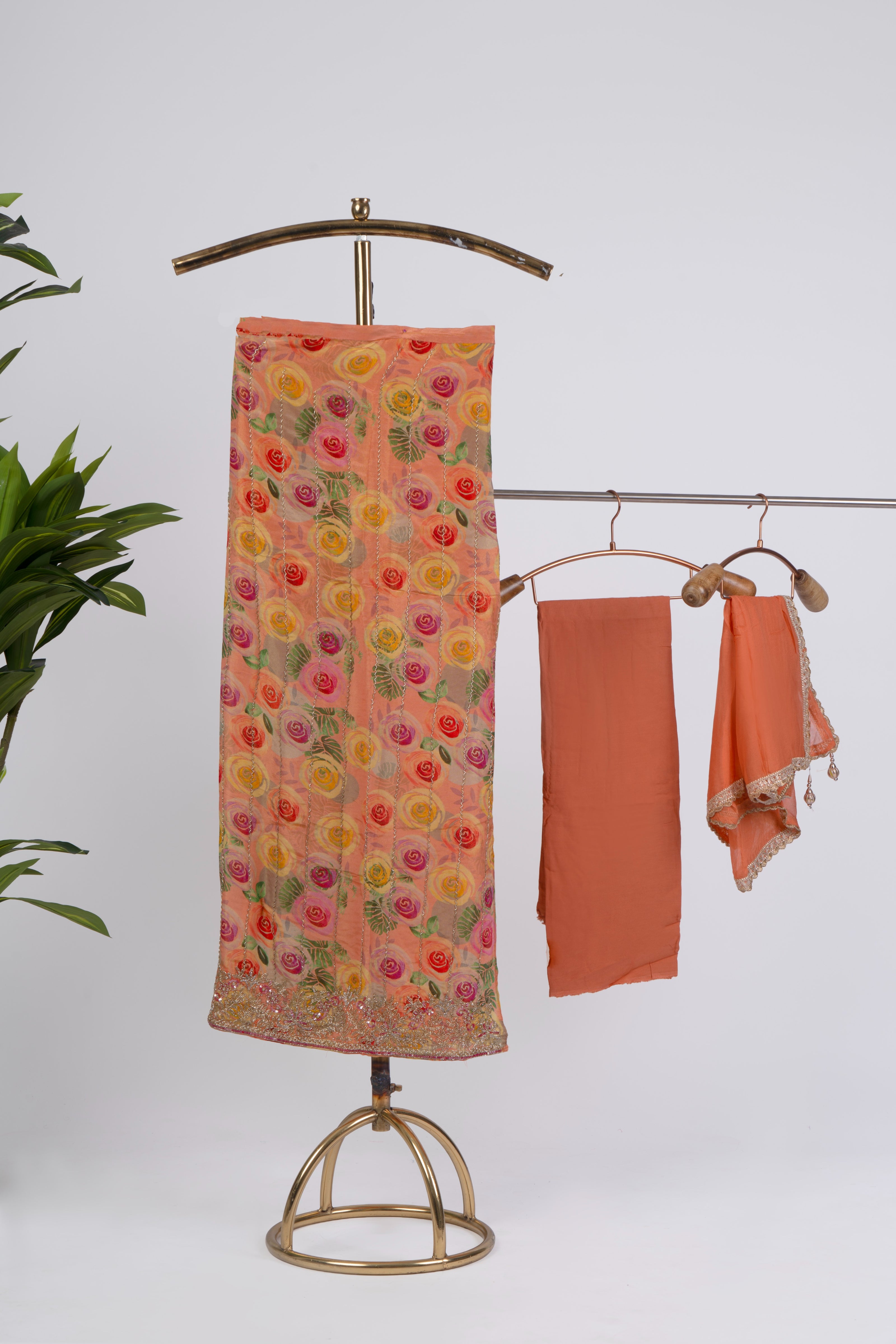 Soft Tissue Crepe Floral Suit Set with Hand Embroidery - Peach