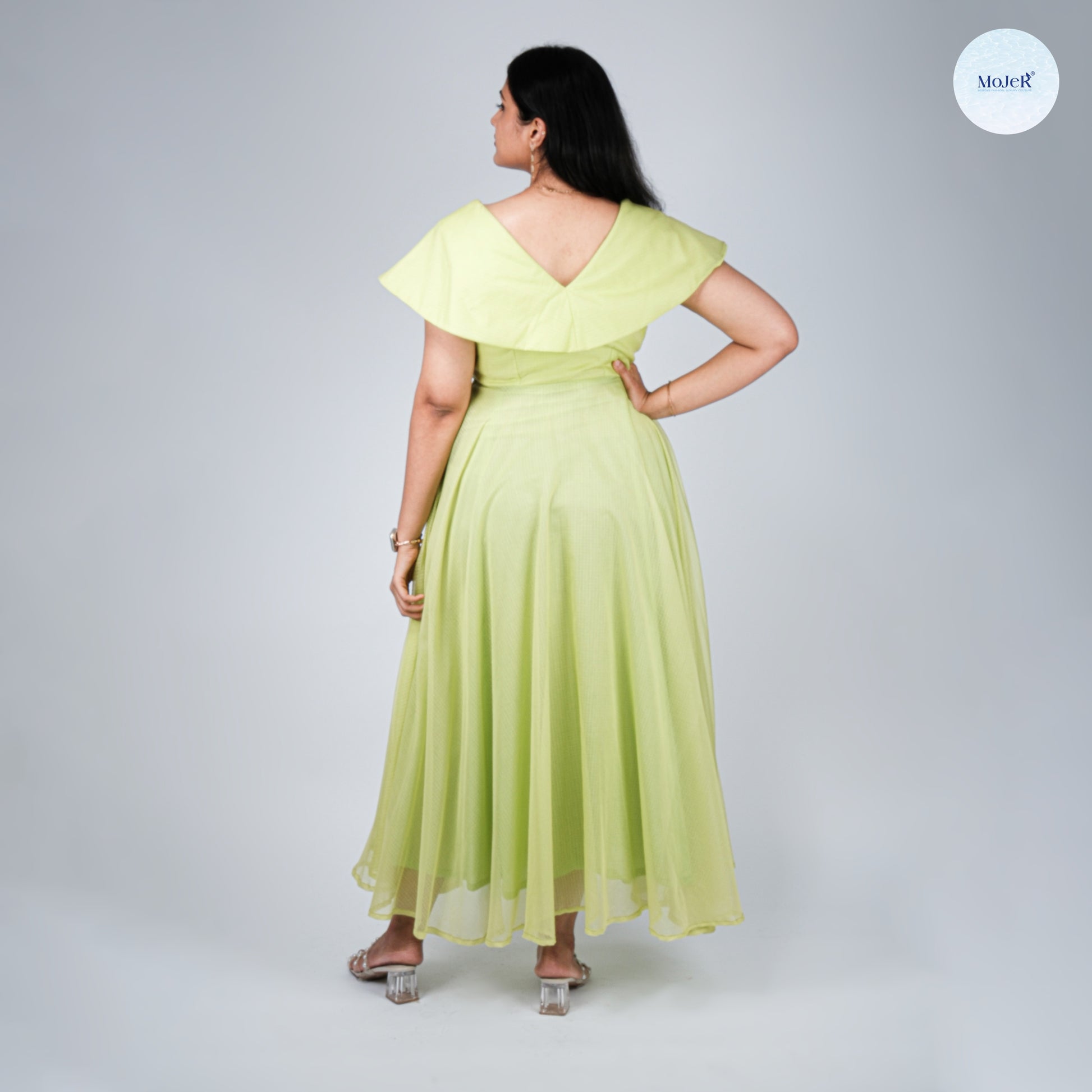 Subtle sophistication meets artistic detailing in this Lime Green Kota Fabric Dress, featuring exquisite hand-embroidered bird motifs on the shoulder with blooming florals. The lightweight Kota fabric ensures graceful drape and comfort, making it an ideal choice for brunches, garden parties, and festive celebrations.