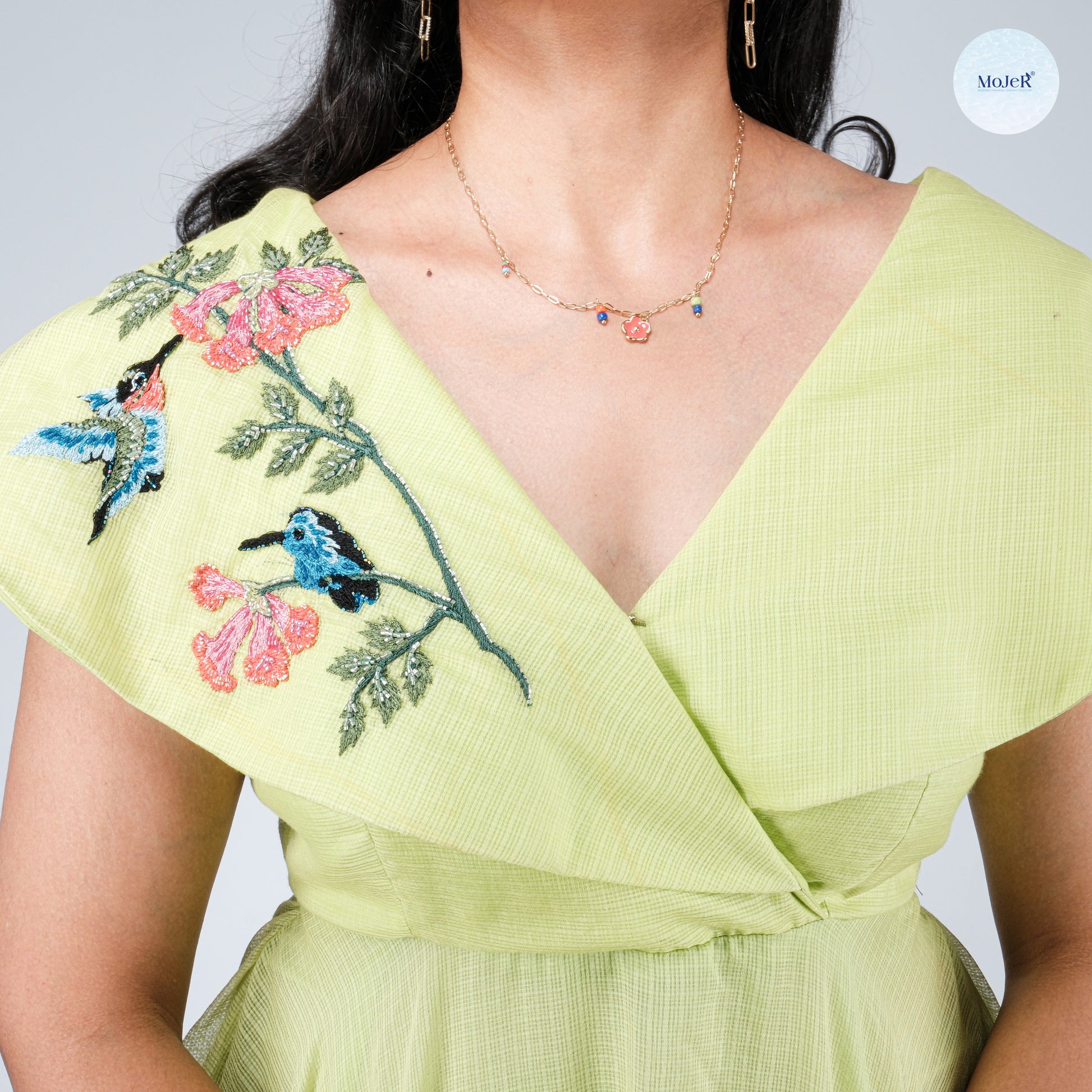 Lime Green Kota Fabric Dress with Hand-Embroidered Birds