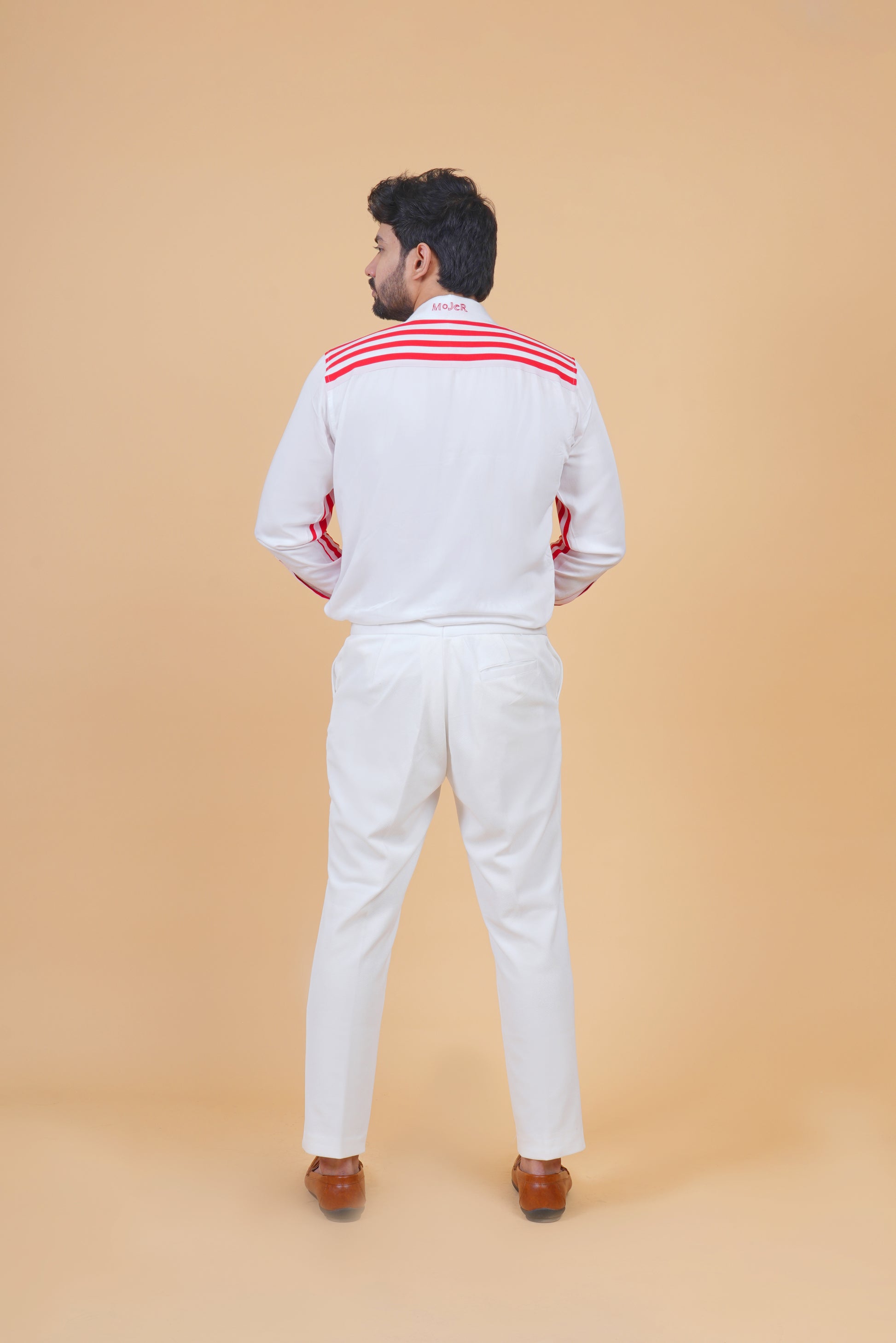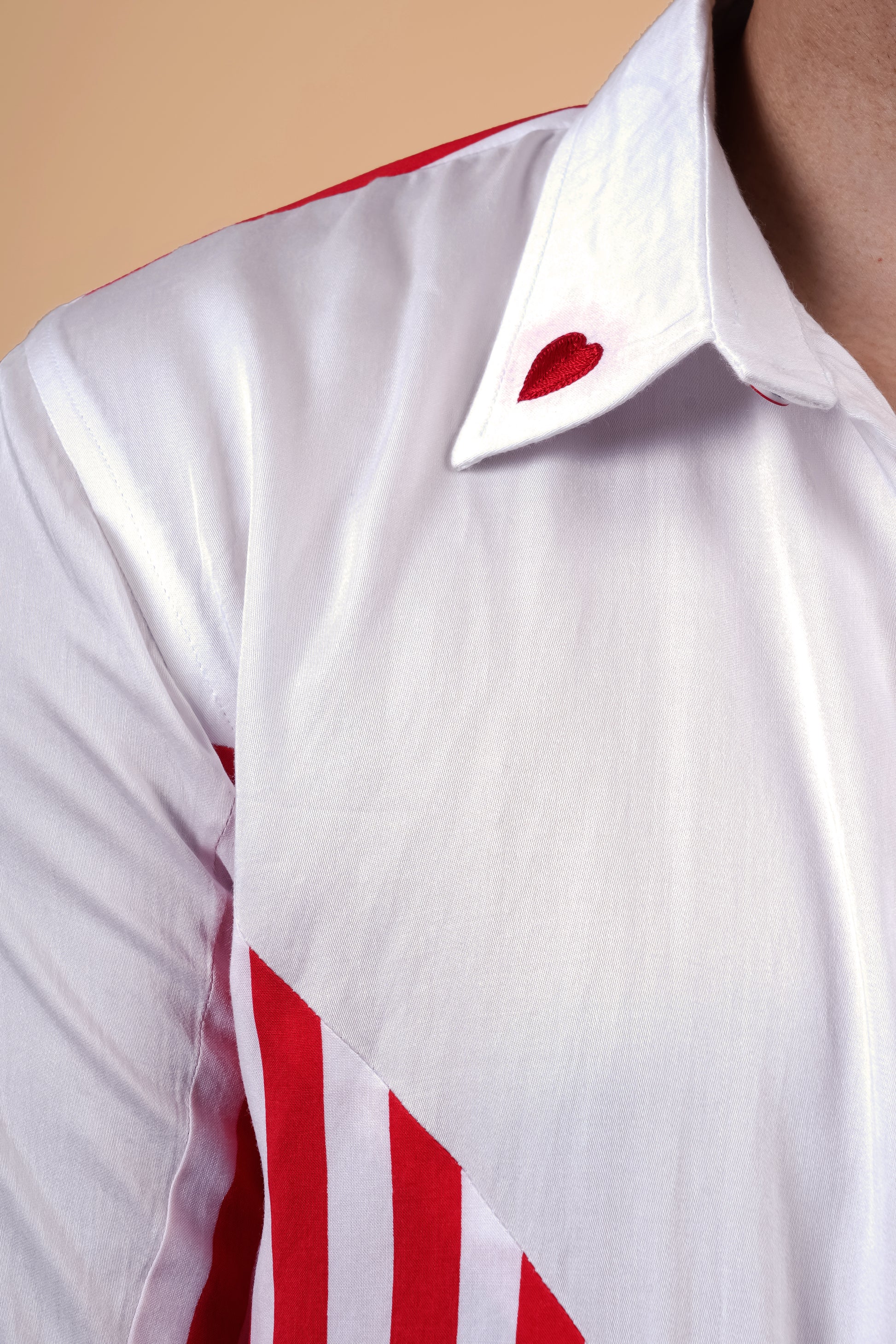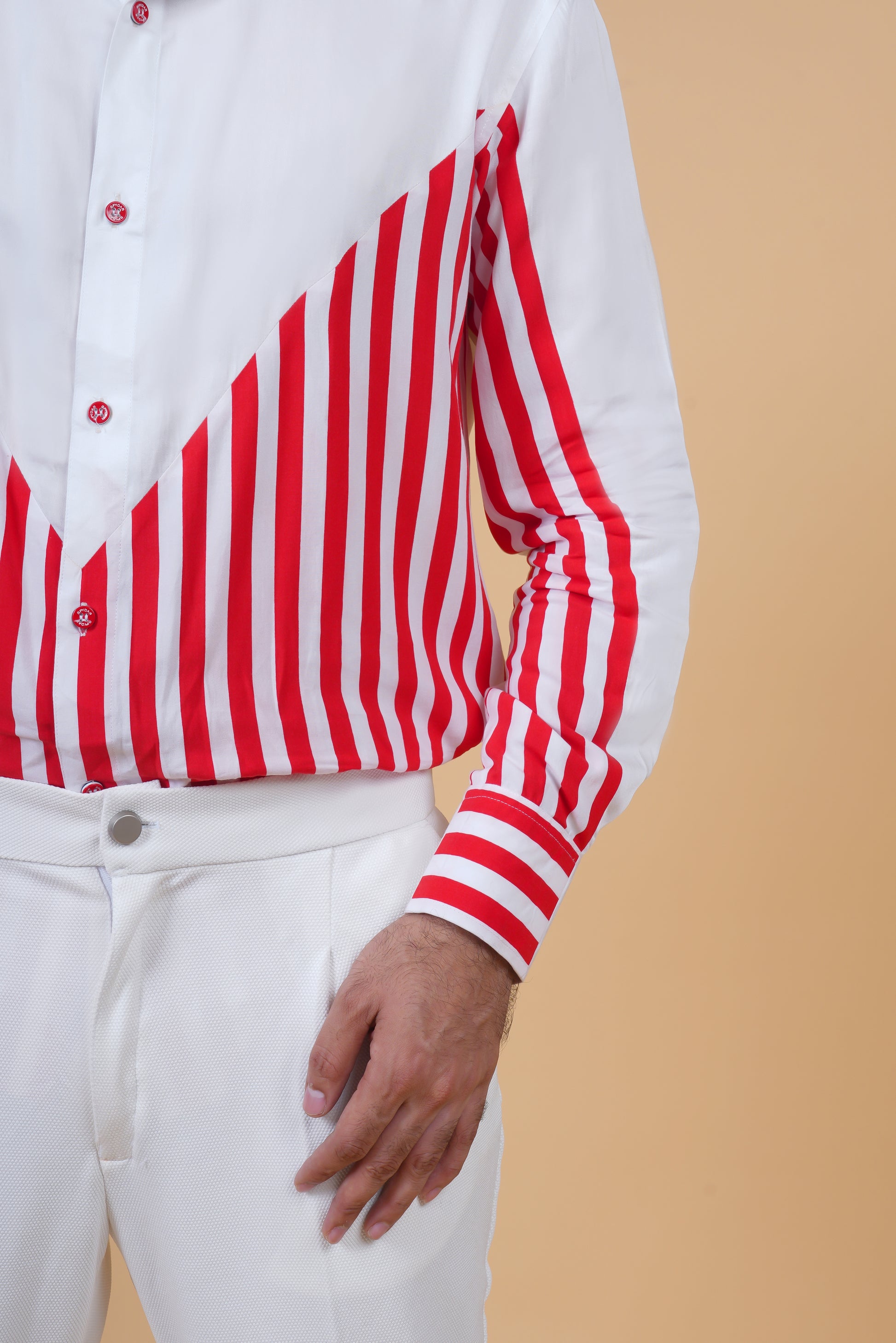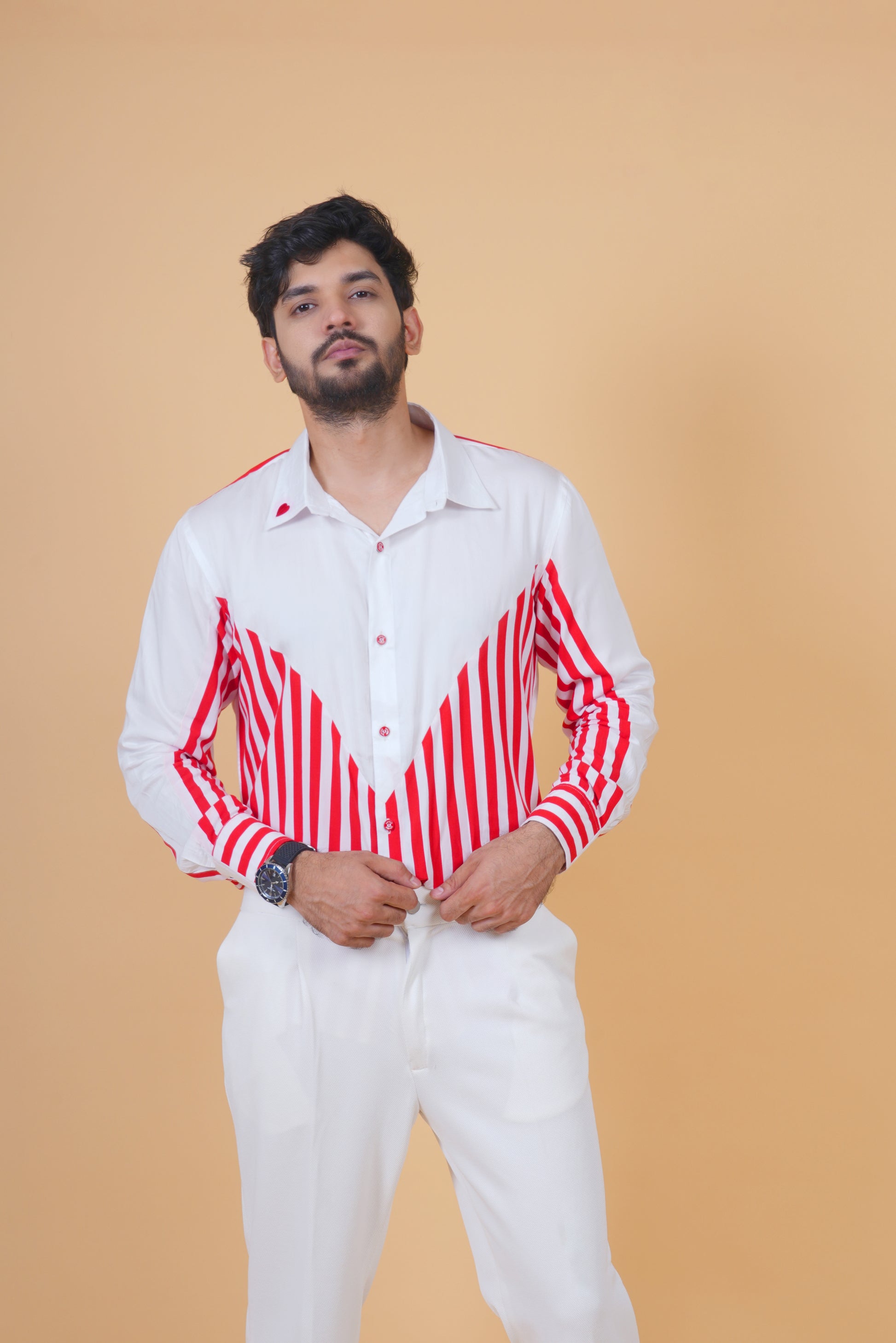 Turn heads with our Men's Red & White Striped Cotton Shirt. A bold statement piece that blends classic stripes with a modern geometric design. Crafted in breathable cotton, this shirt delivers an effortless mix of confidence and comfort, ideal for both day wear and party evenings.