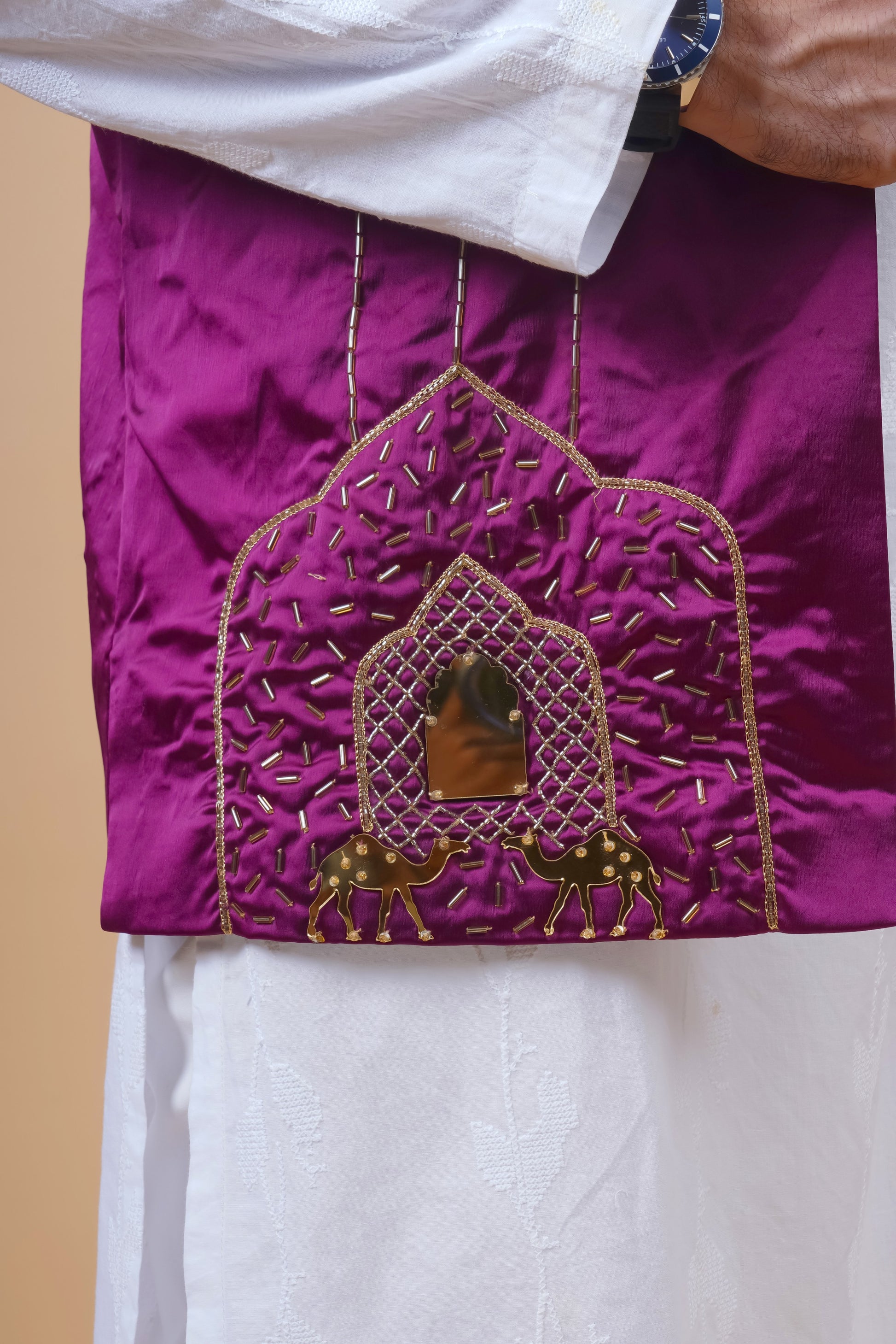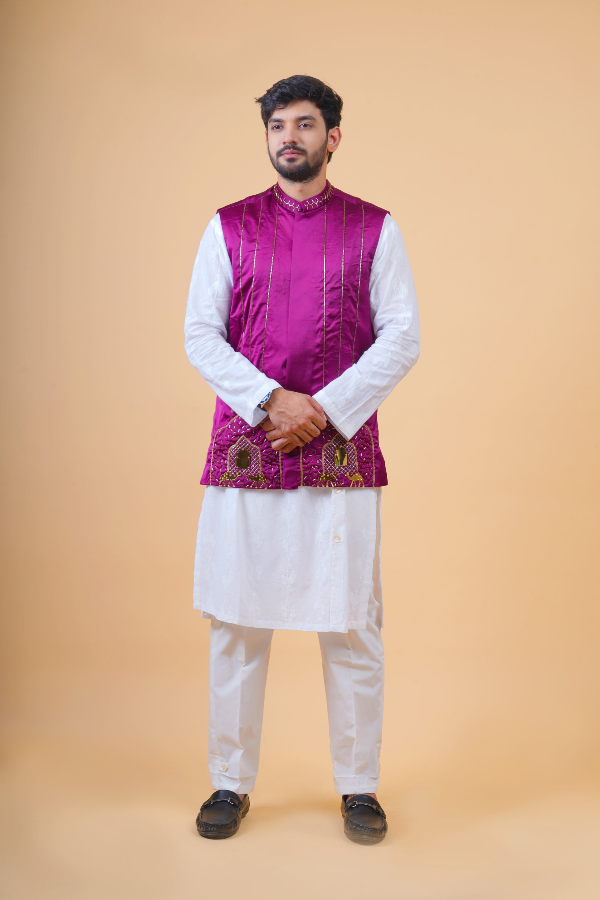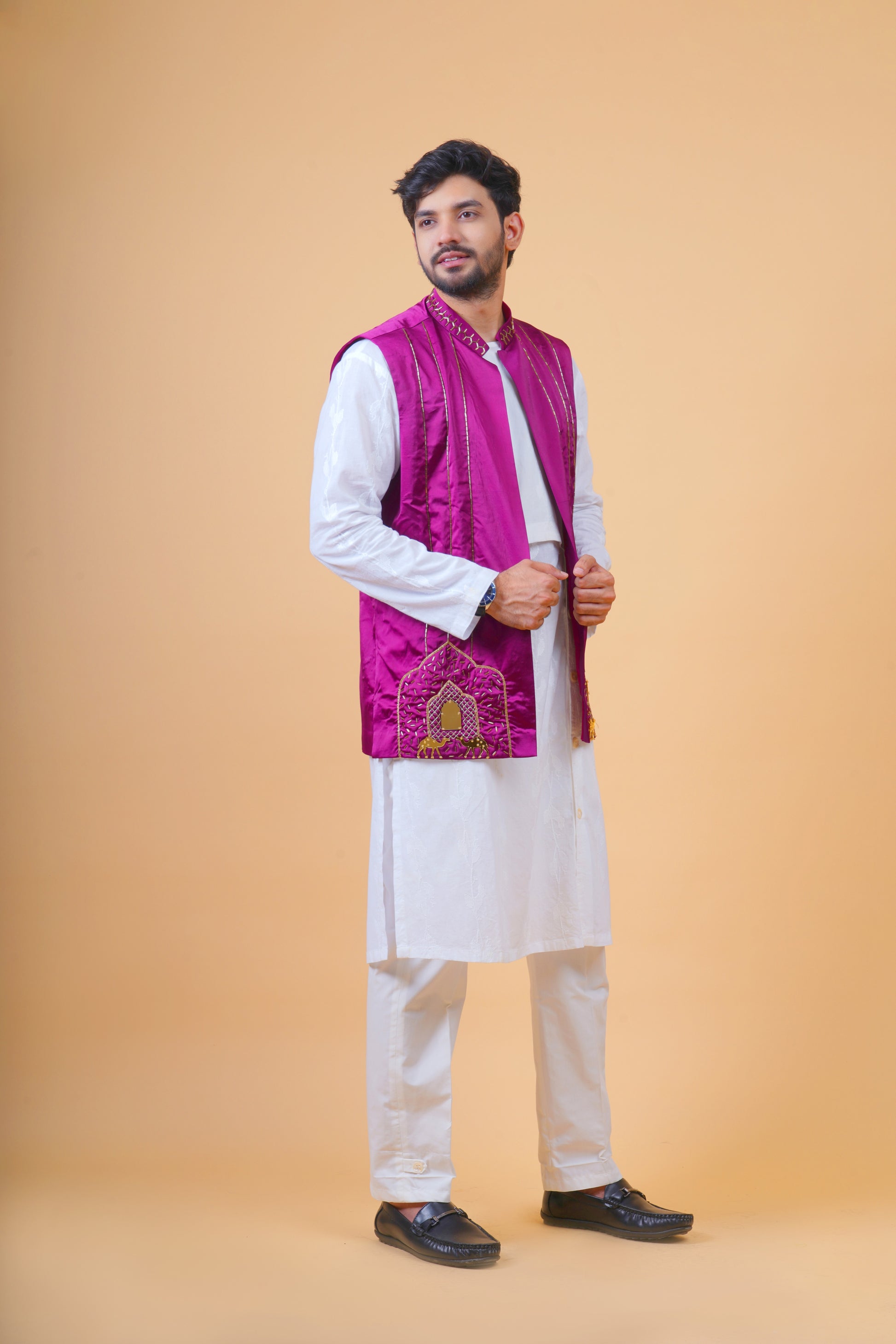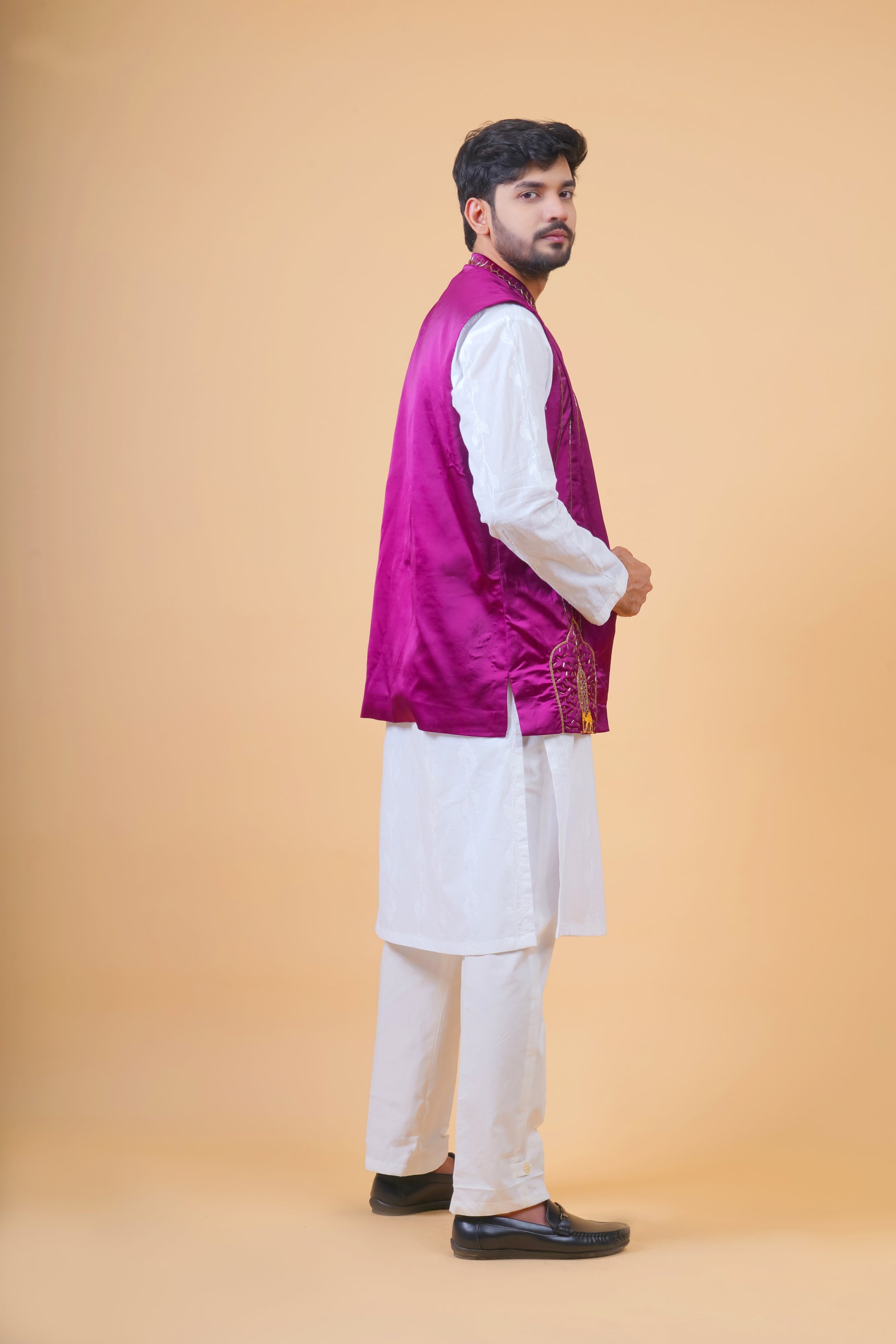 Elevate your festive look with our Men's Wine Satin Lycra Embroidered Nehru Jacket Set. This royal ensemble features a richly hand-embroidered Nehru jacket crafted from premium satin lycra with stretch comfort, paired with a pristine cotton kurta and pants. Perfect for celebrations, weddings, and cultural evenings, this outfit combines elegance and craftsmanship seamlessly.