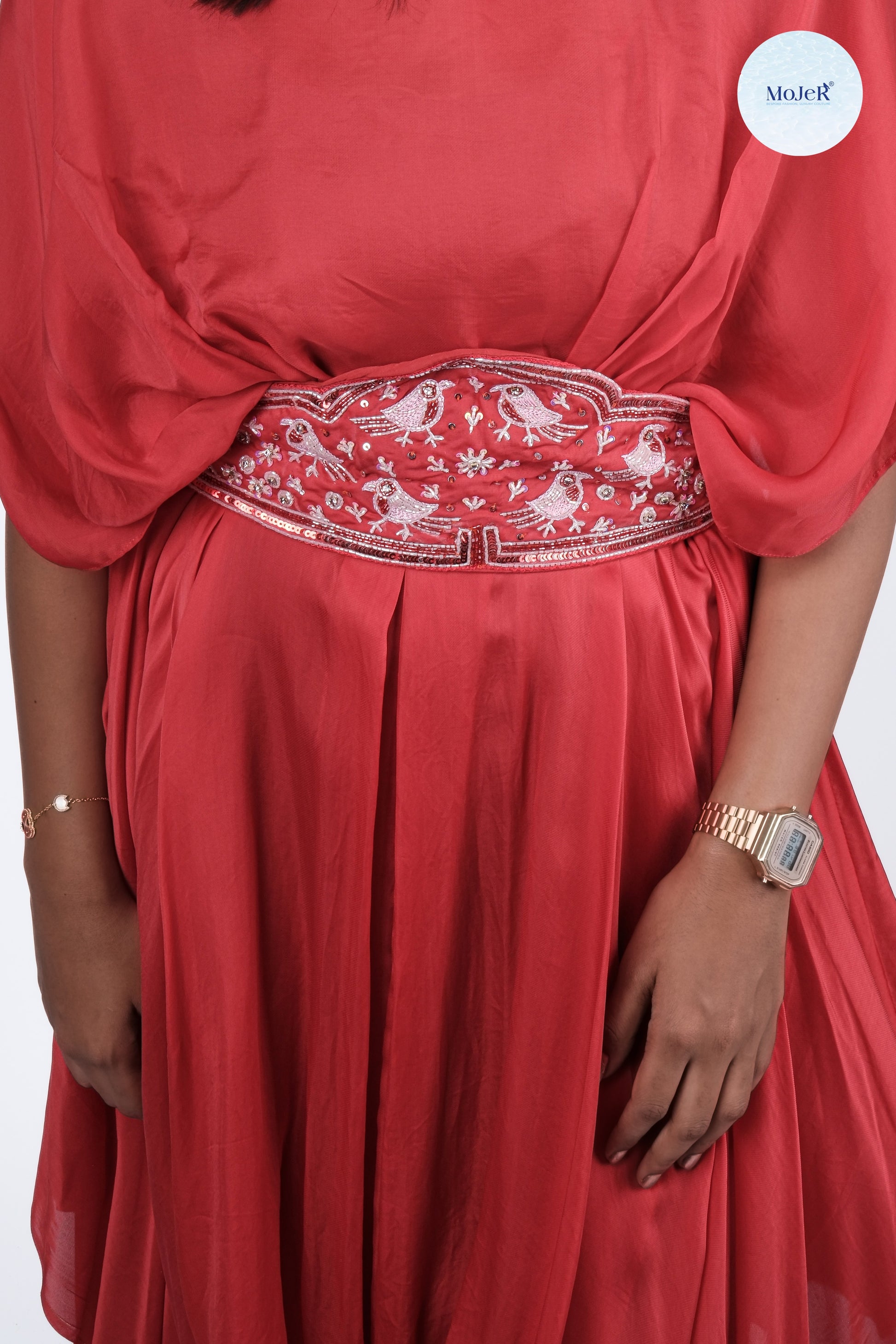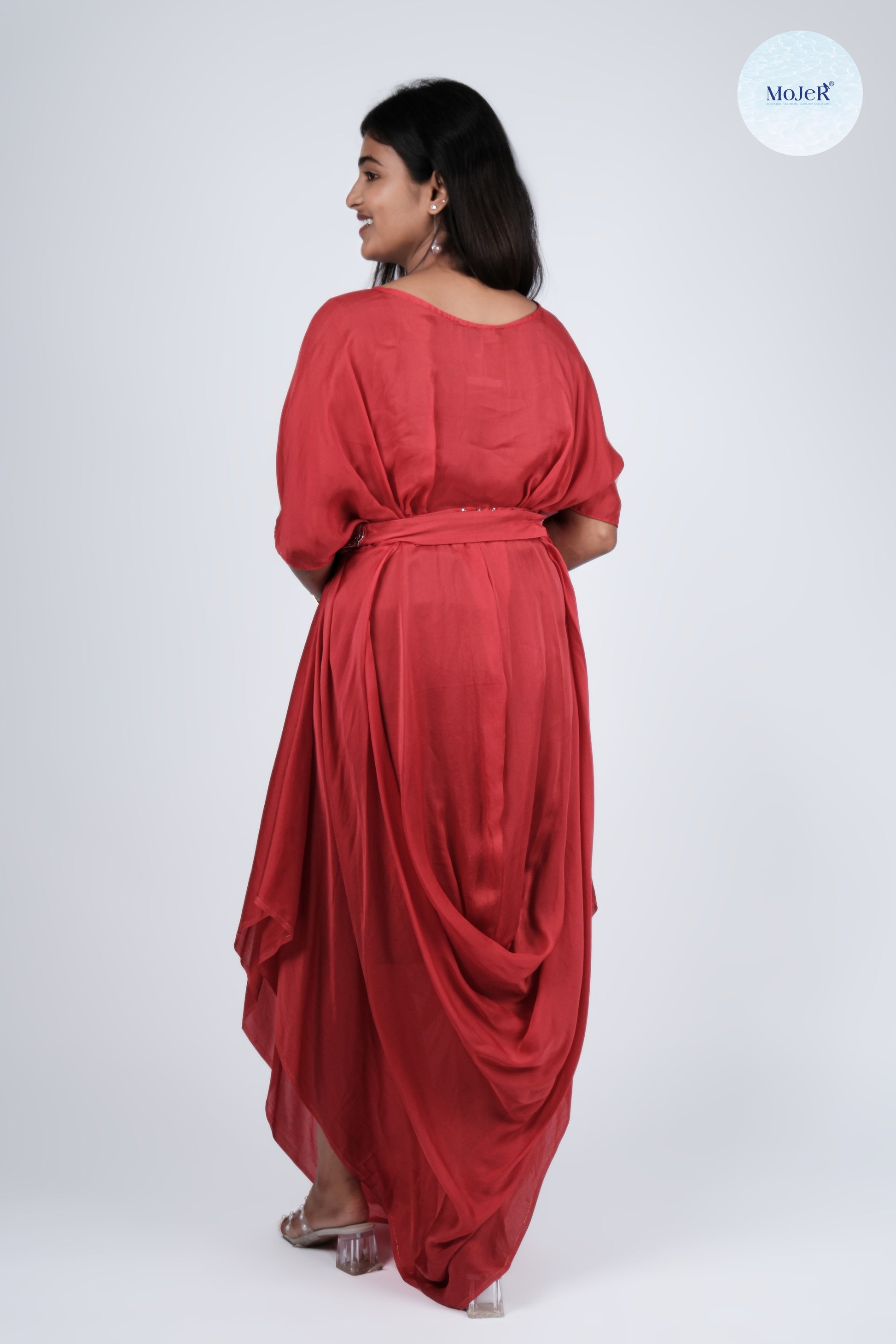 Red Satin Organza Cowl Gown with Hand-Embroidered Detachable Belt
