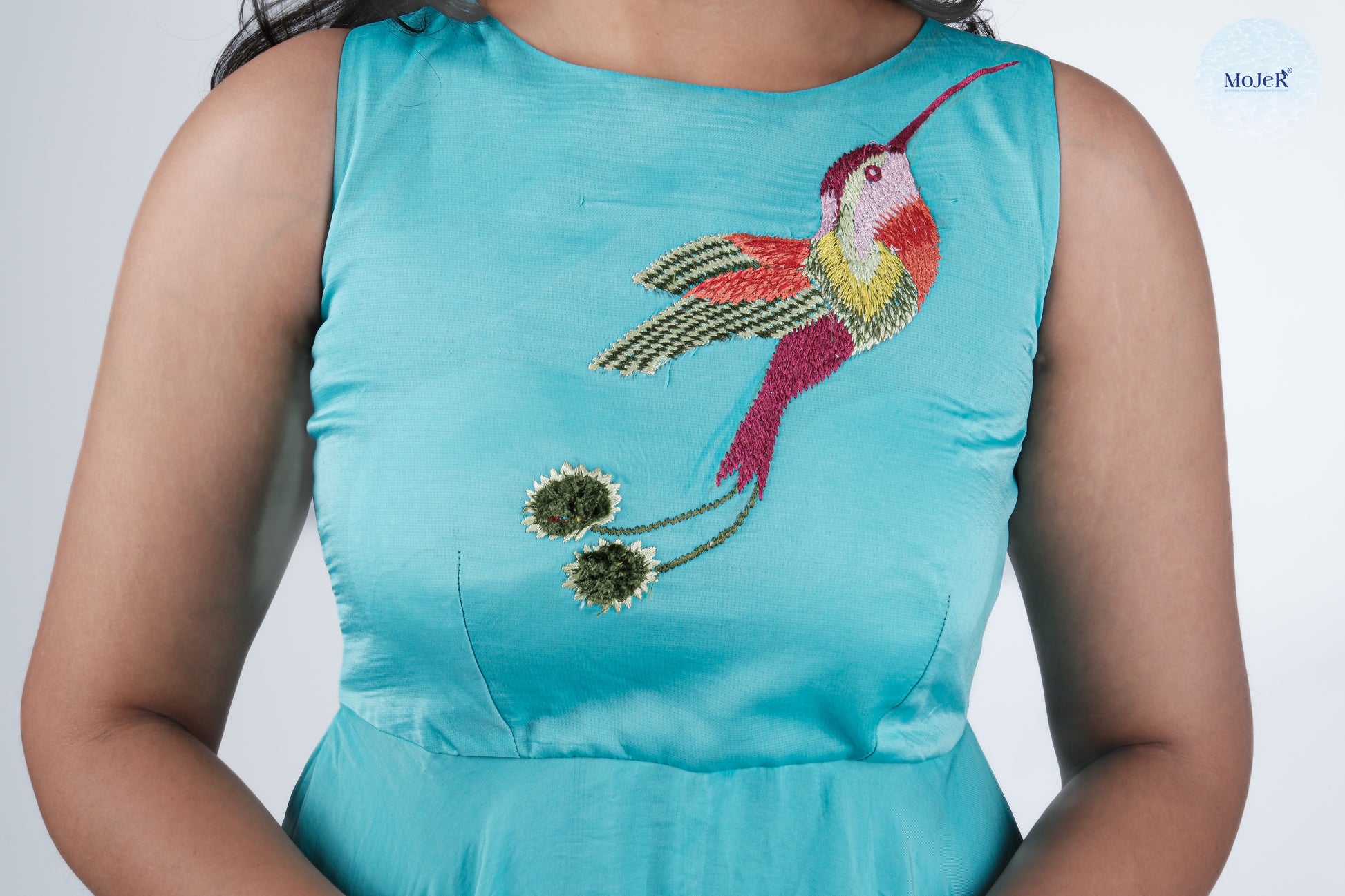 Turquoise Ombre Satin Organza Gown with Hummingbird Embroidery